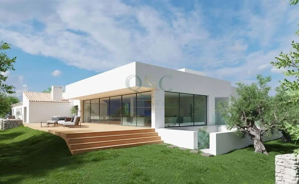A rare opportunity to purchase a large, elevated plot of land with an approved Project in Santa Catarina Fonte do Bispo, for the renovation and extension of an old farmhouse ruin to create a two-bedroom guest annex linked to a magnificent, new two-bedroom villa with a large basement, roof terrace and swimming pool. Nestled in the hills near Santa Catarina, the property is set in a secluded 1.5 ha. (3.7 acres) plot of upland meadow, filled with local trees (olive, almond, carob, fig, medronho) and has stunning views of the surrounding hills and distant ocean. The proposed new villa has been designed to create spacious and light-filled interiors. Floor-to-ceiling windows and sliding glass doors allow light to pour into the substantial, south-facing living room and adjoining kitchen/ dining area. Two generously sized bedrooms have en-suite bathrooms and dressing areas. A huge basement (343 m2) extends underneath the whole building, offering a garage large enough for four cars, a technical space (designed as a sound studio), laundry, a wine cellar, a media room, and a patio that allows daylight to fill the adjacent rooms. A roof terrace, with a technical area, support kitchen, and lounge area, covers the whole house and affords spectacular views of the surrounding countryside and the sea. The restored old farmhouse has been designed as a separate guest annex with a more traditional feel and offers a cozy living room, two en-suite bedrooms, and a kitchen/dining area with south-facing views. The proposed property offers 495 m2 of construction area and has the potential for further development to create a rural tourism project with the addition of four more T0/T1 studio apartments. This idyllic rural setting offers peace and tranquillity, yet minutes away from the town of Santa Catarina and its local amenities, while Tavira and Olhão are both only around 15 km away. It is an exceptional opportunity to realize the creation of a stunning villa as your main home, holiday home, or as rural tourism business.