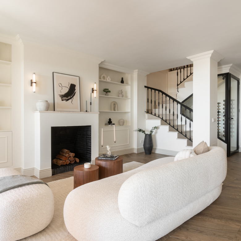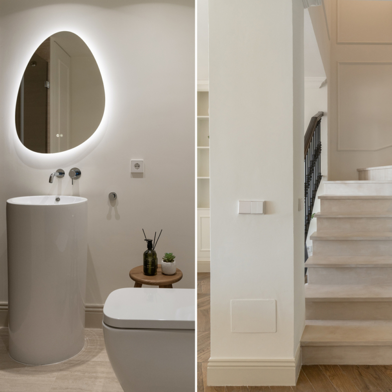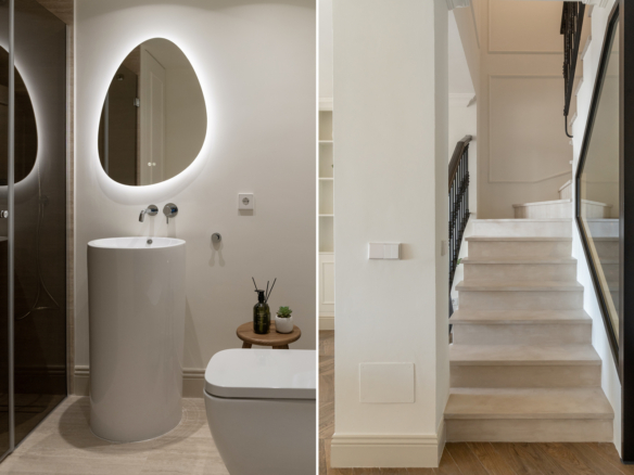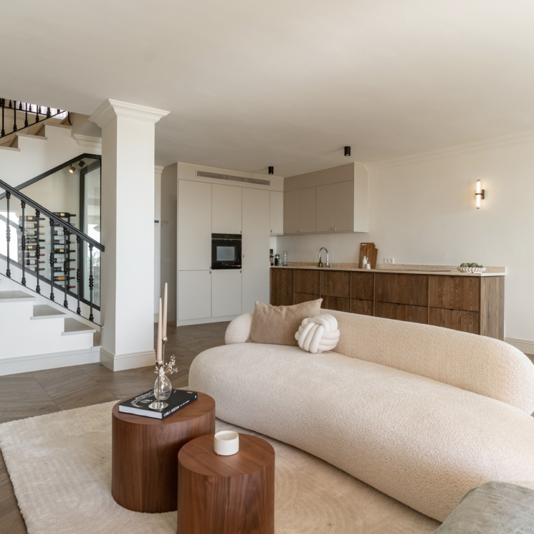 This stunningly renovated 4-bedroom, 3-bathroom duplex seamlessly blends Scandinavian elegance with Mediterranean charm. Designed for both comfort and style, the home features warm wooden accents, a sleek microcement staircase, and refined Scandinavian stucco moldings.
