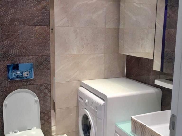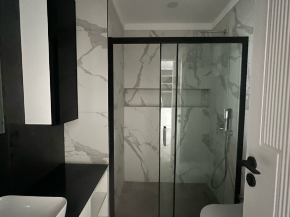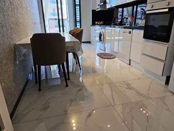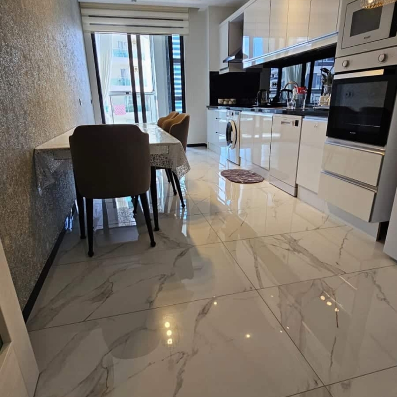 Theseparate kitchenadds to the practicality. Solid wooden cabinets, marble floors, and a wide countertop reflect a classic Turkish design. Unlike many compact open kitchens, this one is spacious enough to fit a dining table—ideal for everyday family meals.