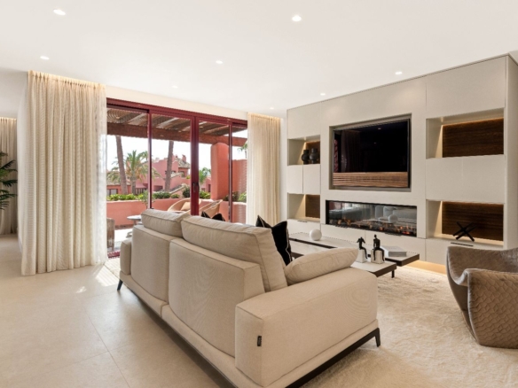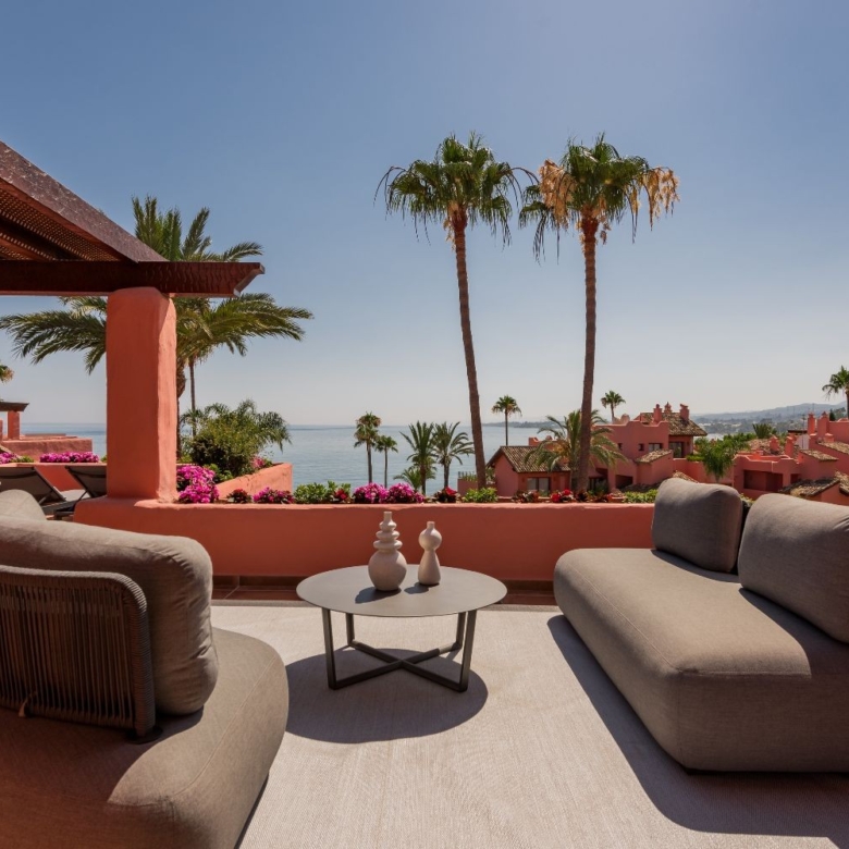 Fully renovated top quality 3-bedroom duplex penthouse in Cabo Bermejo. Frontline beach, south facing, sea views, quiet and private. Direct access to the beach. Spacious living and dining area with fully fitted open plan kitchen (Siemens appliances) and direct access to a large terrace, two guest bedrooms and two bathrooms. Master bedroom ensuite in second level with large terrace and sauna.Two underground parking and two storages. Communal nature, lush gardens, gym and community outdoor and indoor pool. Great location. Less then 5 minutes drive to all amenities.