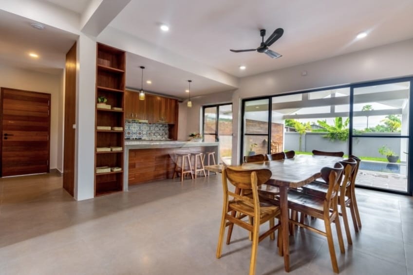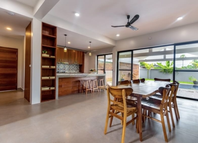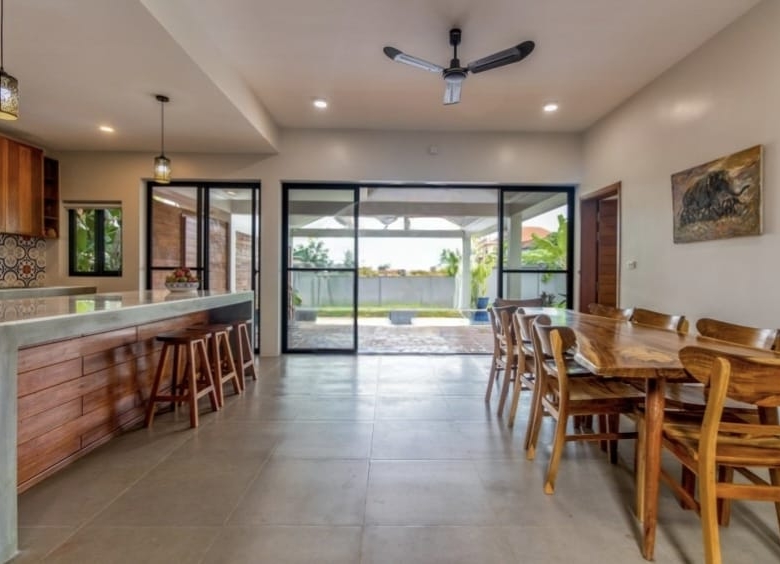 Dining Area: Full pool view, blending indoor comfort with outdoor relaxation