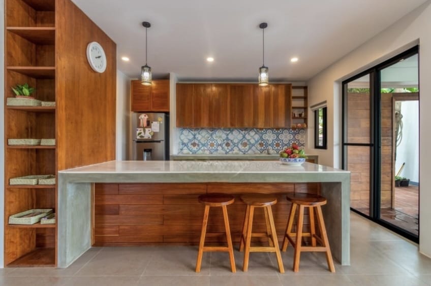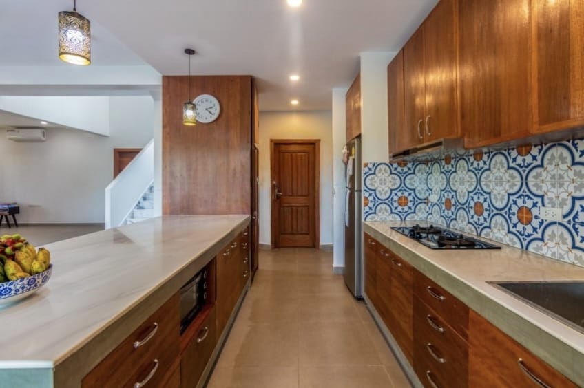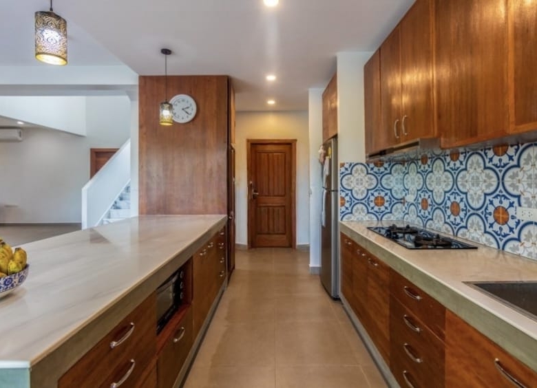 Kitchen: Dual counters for efficiency—one serving as a breakfast nook, the other fitted with a built-in stove, exhaust hood, and integrated cabinetry