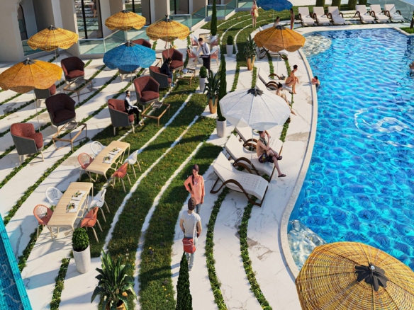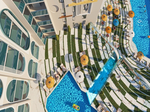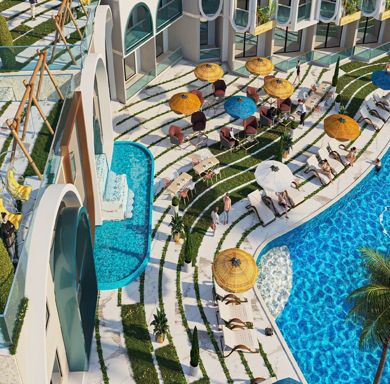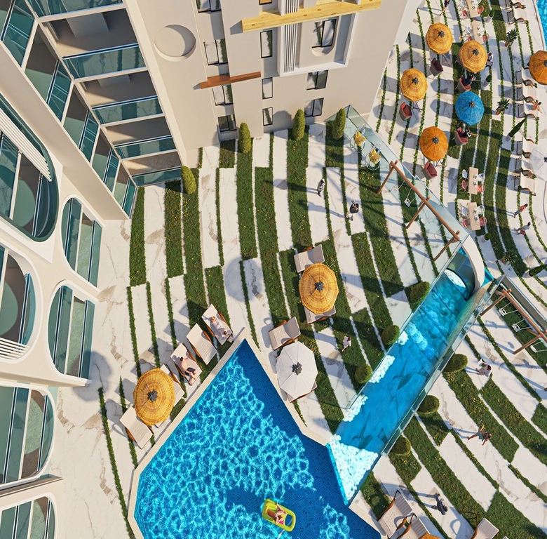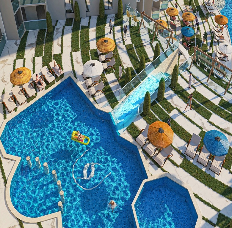 The project boasts a spacious outdoor area with a beautiful swimming pool, a garden, and a relaxing terrace where you can soak up the sun. The large windows and balconies in the apartments allow you to enjoy the breathtaking views.