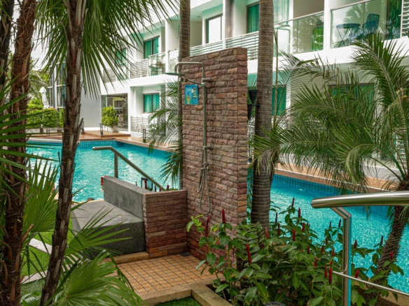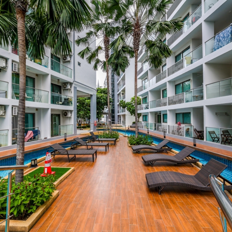 Laguna Beach Resort 1 is just a short drive from Jomtien Beach, with easy access to restaurants, cafes, and local shops. The development features resort-style facilities including a large lagoon swimming pool, fitness center, tropical gardens, 24-hour security, and secure parking.
