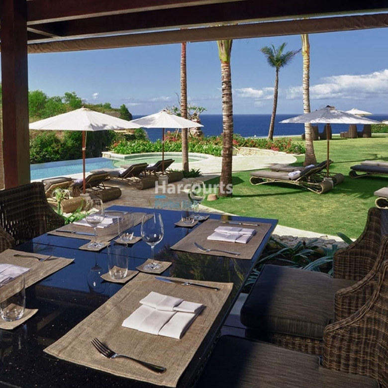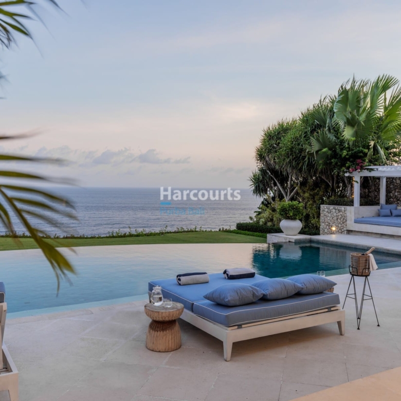 This newly refurbished, absolute clifftop villa in Bali’s renowned cliff-front resort is an exquisite sanctuary that merges award-winning design by UBD with an inviting sense of relaxation. Set on an expansive 2,514 sqm FREEHOLD plot with 30 meters of cliff frontage, the villa commands unobstructed, panoramic views over the Indian Ocean. Thoughtfully designed across multiple buildings, this five-bedroom villa perfectly balances communal areas with private retreats, providing each guest with a personalized haven of comfort and privacy. The master suite, located in the main building, spans the entire upper floor and opens onto a private veranda, while additional bedrooms are housed in separate buildings connected by lush garden pathways.