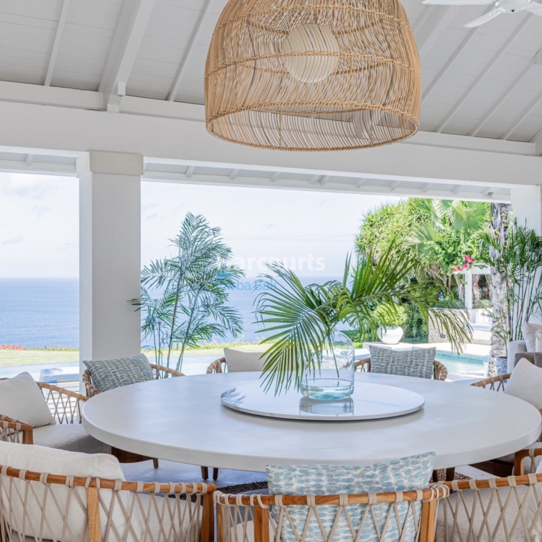The villa’s open-plan layout offers seamless indoor-outdoor living. Floor-to-ceiling windows invite abundant natural light and frame stunning ocean vistas. Outside, a 20-meter infinity pool appears to merge with the sea, while the cliff-edge bale and surrounding sunbeds create the ultimate setting for sunset lounging. An expansive entertaining bale, complete with a bar, dining area, and BBQ facilities, is designed for memorable gatherings and special events.