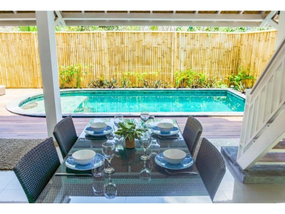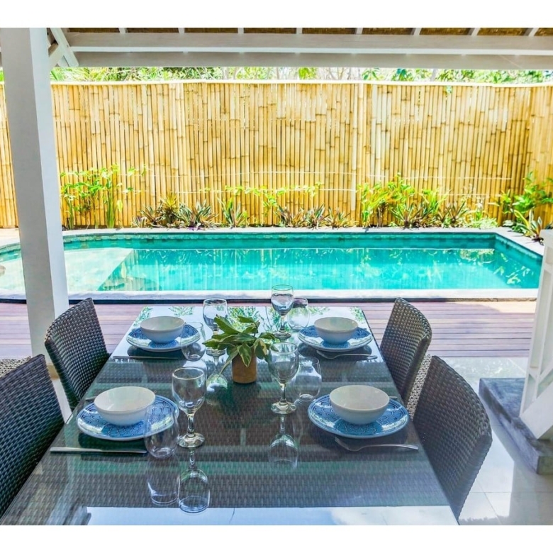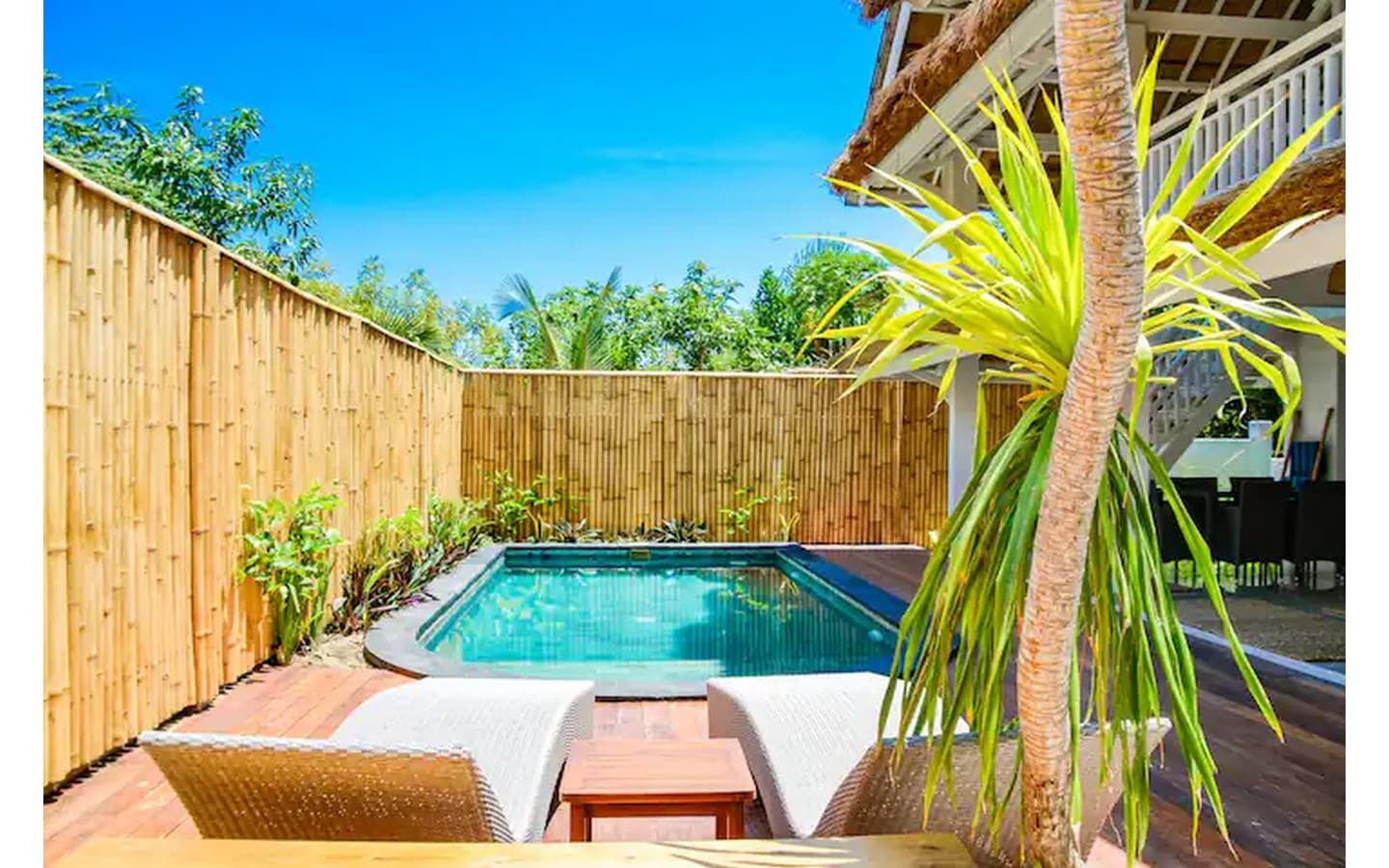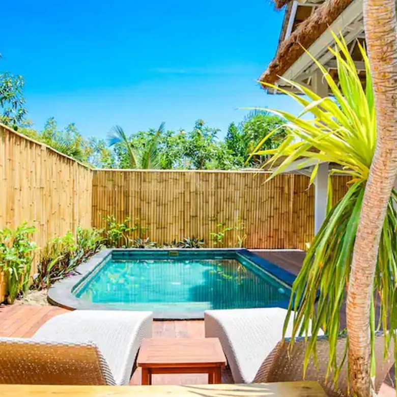 Located in the quiet northern part of Gili Air, this villa is an exceptional find. Built in 2016 and extensively renovated in 2021, it covers 190 sqm on a 240 sqm plot. It features two spacious, air-conditioned bedrooms that comfortably accommodate up to five guests. The property includes a private pool, a fully equipped kitchen, and two living areas—both open-air—ideal for unwinding after a day of island adventures. Just 180 meters from Camilla Beach, it offers easy access to snorkeling, dining, and all the best spots on the island, all within a 30-minute walk.