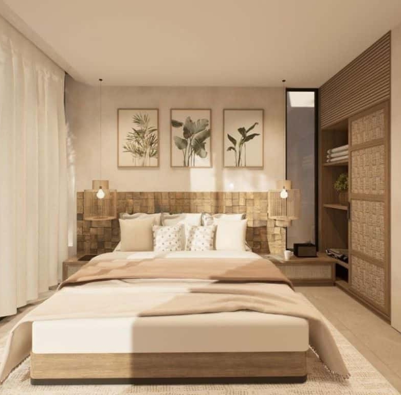 Each villa spans three thoughtfully designed floors, beginning with a ground level that opens seamlessly into a lush garden. Expansive glass elements blur the line between indoor and outdoor living, creating a sense of openness and harmony. On the first floor, two serene bedrooms with private bathrooms overlook a peaceful orchard and a private garden pool. The second floor is home to the master suite—complete with an elegant en-suite bathroom and private rooftop terrace, ideal for taking in Bali’s signature sunsets.