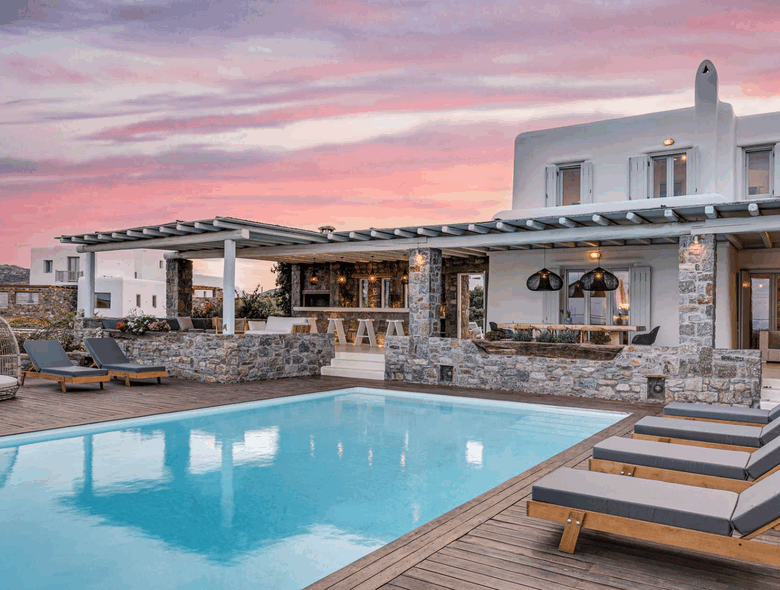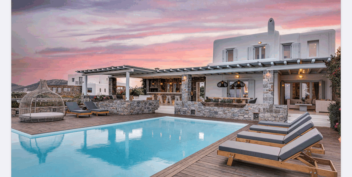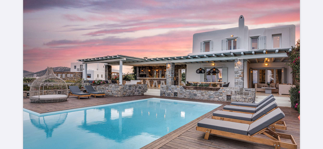 The villa includes five serene bedrooms, each with an en-suite bathroom, air conditioning, and either sea or garden views. Refined wooden details, soft tones, and artisanal finishes add character and authenticity, evoking the understated elegance of the Cyclades.