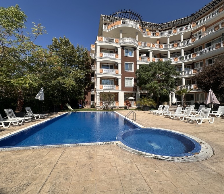Sunny 1 BED apartment, 70 sq.m., in Villa Aria, center of Sunny beach We are glad to offer you this stylish 1 BED apartment for sale in Villa Aria holiday complex situated in the central zone of Sunny Beach sea resort. The complex is located in the quiet part of Sunny Beach, just 10 minutes walking distance from downtown and from the coast. The outstanding location of Villa Aria and the wonderful existing facilities give good opportunity to the owners and their guests for a peaceful and relaxing vacation and year-round residence. Within short walking distance there are several supermarkets, restaurants, pharmacy, candy shop (all open 4 seasons). The beach is 250 m away. The apartment we offer for sale is located on the 2nd floor and looks towards the pool of the complex. Total living area – 70 sq.m., comprising of: – hallway; – spacious and sunny kitchen with lounge; – one bedroom; – bathroom/WC; – terrace overlooking the pool New, modern furniture. The apartment is in excellent condition, ready to use. The location makes it perfect for renting out and year-round residence. Villa Area offers: – swimming-pool with children’s part; – landscaped garden; – kids’ playground; – secure access; – food shop. Annual maintenance fee – 12.6 EUR/sq.m. Act 15.