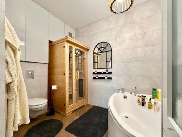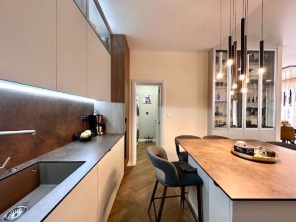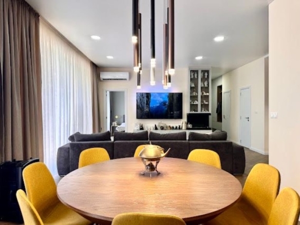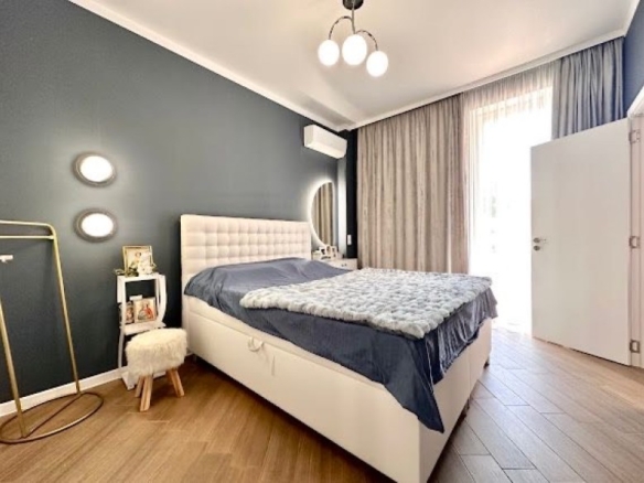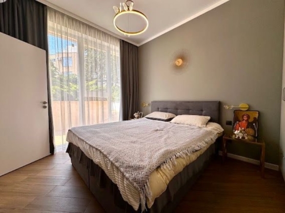 We are pleased to offer this very large apartment, finished to an excellent standard, situated only 100 m to the beach. The property is part of Omega resort, which is located 500 m from the center of the village. On-site facilities include: – outdoor swimming-pool; – gazebo; – BBQ area; – kids center. The apartment is situated on the ground floor and has a total area 150 sq.m. It comprises of: – very spacious open-plan kitchen with living-room – 50 sq.m.; – 2 bedrooms; – 2 bathrooms; – 2 storage rooms; – closet; – cellar. Brand new furniture in excellent condition. All rooms have under-floor heating. Annual maintenance fee – 8 EUR/sq.m.