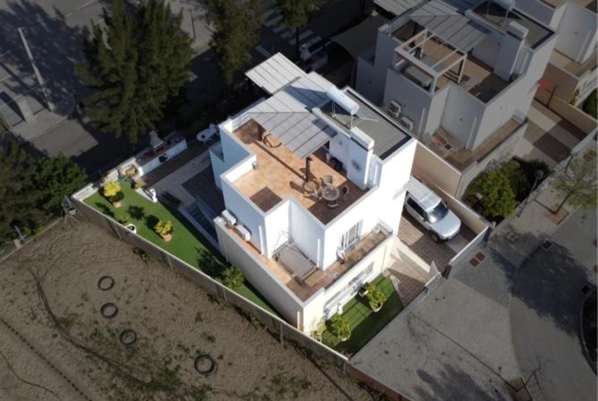 Sold furnished and equipped. Modern, detached 3 bedroom villa inserted in a closed condominium within walking distance to the village of Santo Estevao close to the picturesque town of Tavira. The villa is in a very quiet location. Laid out over 3 floors with basement, ground floor and top floor with sea views.