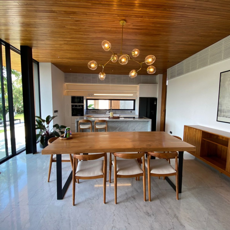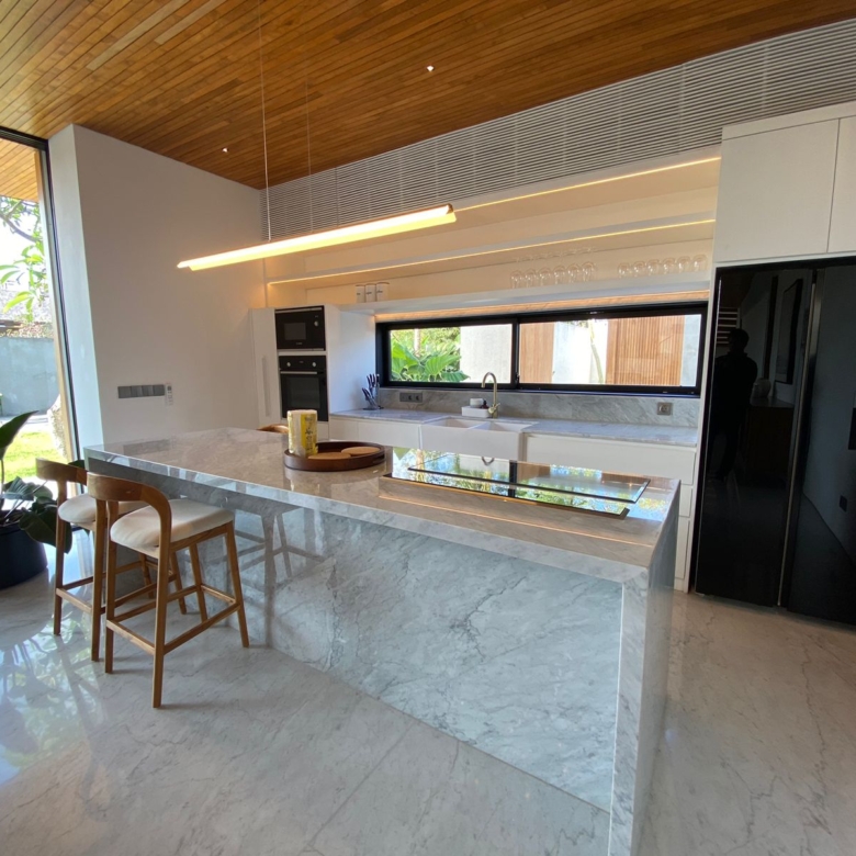 Recently completed in 2023 on 960 sqm of land, the 2 villas have a combined property size of 489 sqm. With six bedrooms and five bathrooms in total, this luxurious villa can comfortably accommodate a large family or use one as your family’s residence while renting the other in the highly lucrative Berawa rental market. The main villa is double storey, stylishly designed and consists of 4 bedrooms. One bedroom can be found on the ground floor while 3 bedrooms are on the upper level. There is also a media/living space on the second floor. The spacious open-plan living/dining area is bathed in natural light and opens up to the beautiful garden and 11m x 3.7m lap pool, providing a perfect setting for relaxation or socializing. The kitchen is fully equipped and comes with a beautiful island.