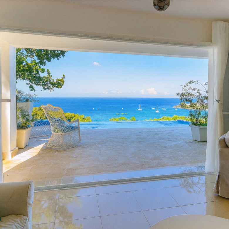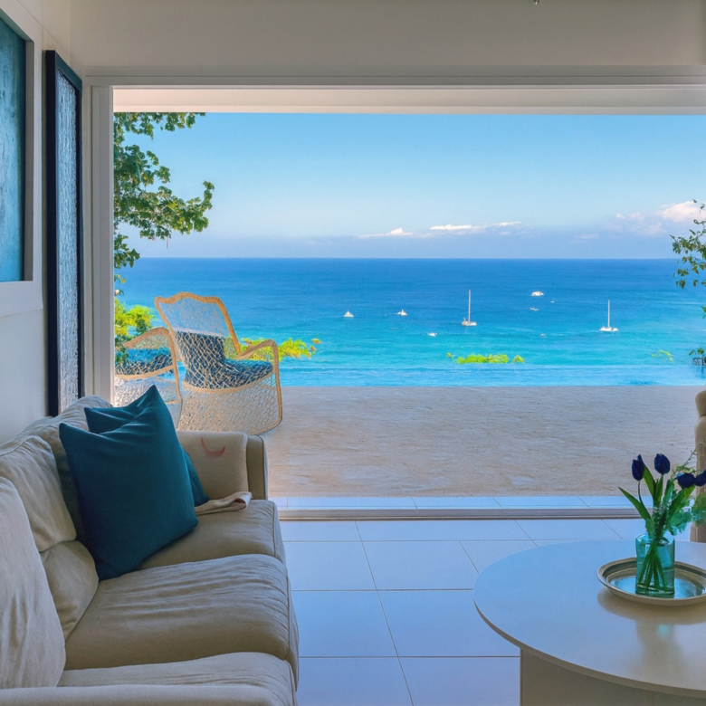 Built on four levels and beautifully renovated, the villa features an elevated infinity pool that projects toward the bay, expansive terraces on each floor, and full-height windows that flood the interior with light while framing the iconic turquoise waters below. The architecture, originally designed by New York architect Ernesto Reyes, blends contemporary lines with a coastal Caribbean atmosphere, creating a sense of openness, privacy, and vertical elegance.