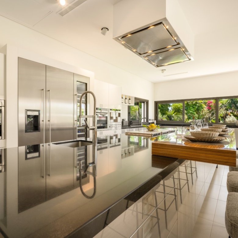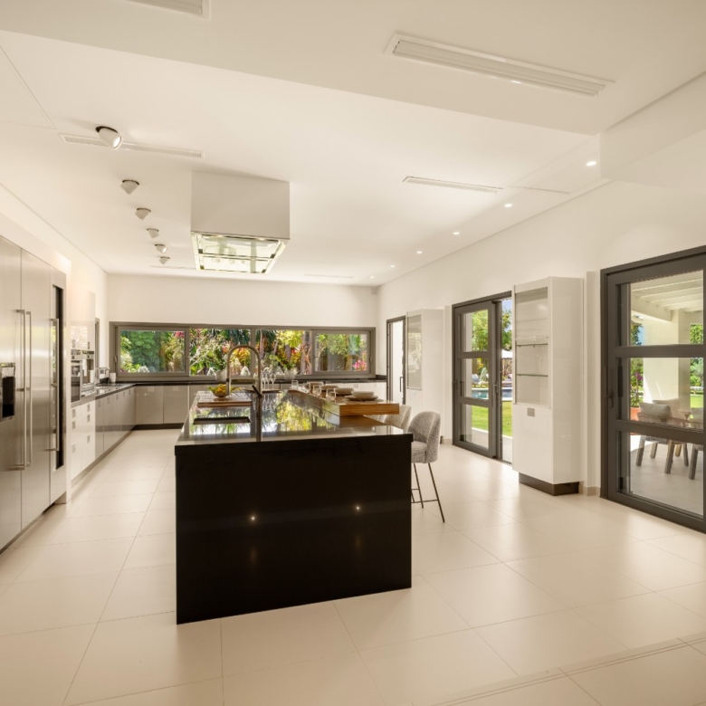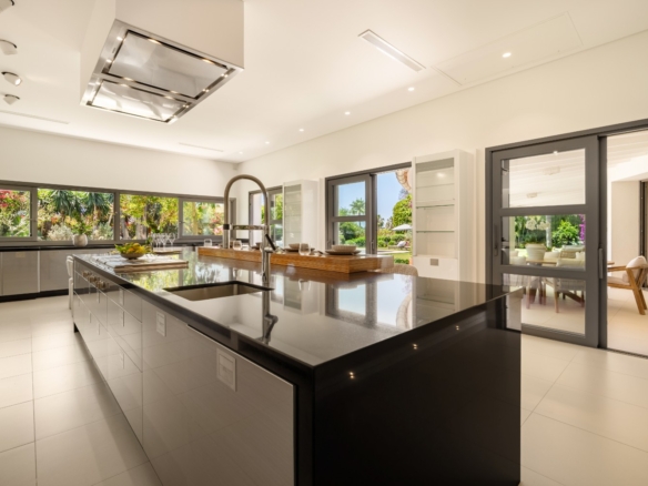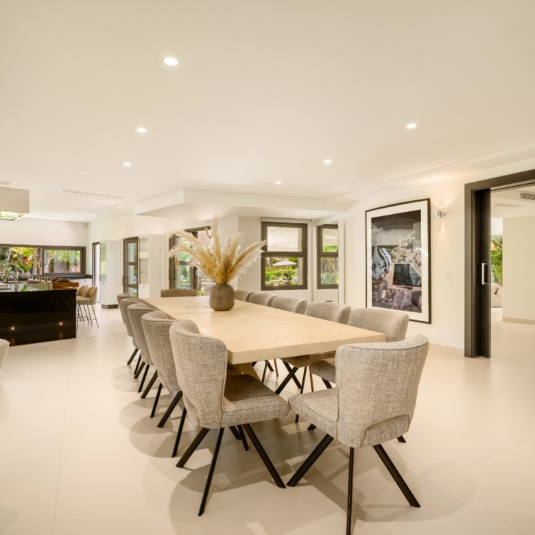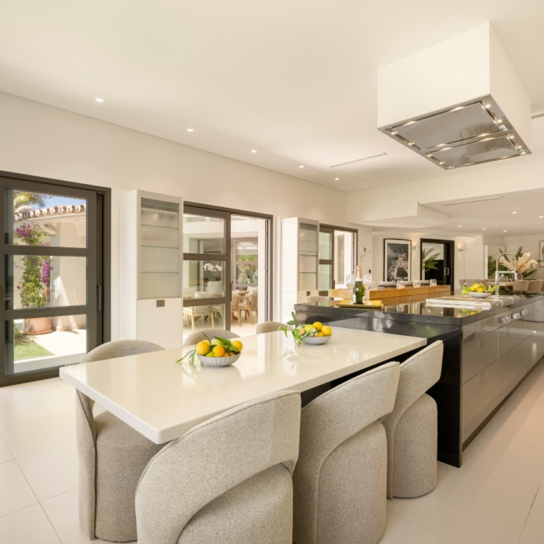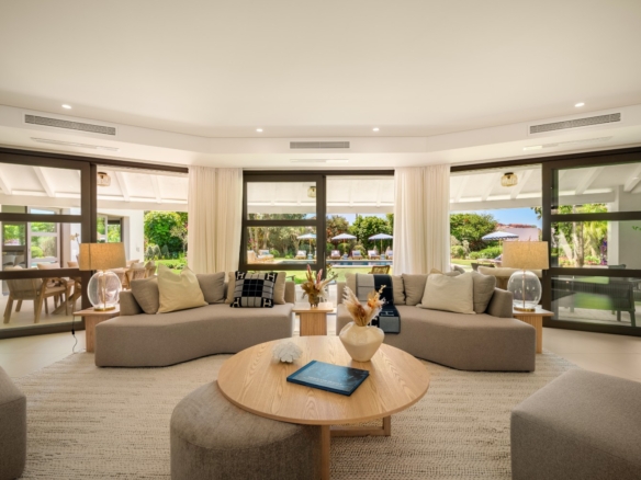 This exquisite south-facing bungalow is located in the prestigious La Cerquilla area of Nueva Andalucía, offering partial golf views and year-round sun. Set on a flat 3,062 m² plot with 603 m² of built space, the single-level home provides seamless indoor-outdoor living and direct garden access from all bedrooms.