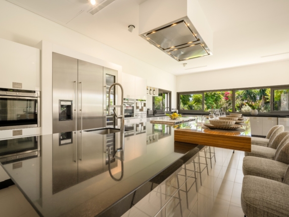 Highlights include five bedrooms and five bathrooms, two large living areas, a home office, a Danespan open-plan kitchen with two dining spaces, and a wraparound covered terrace. Additional features include a four-car garage, Lutron lighting, Technal security windows, and a water tank.