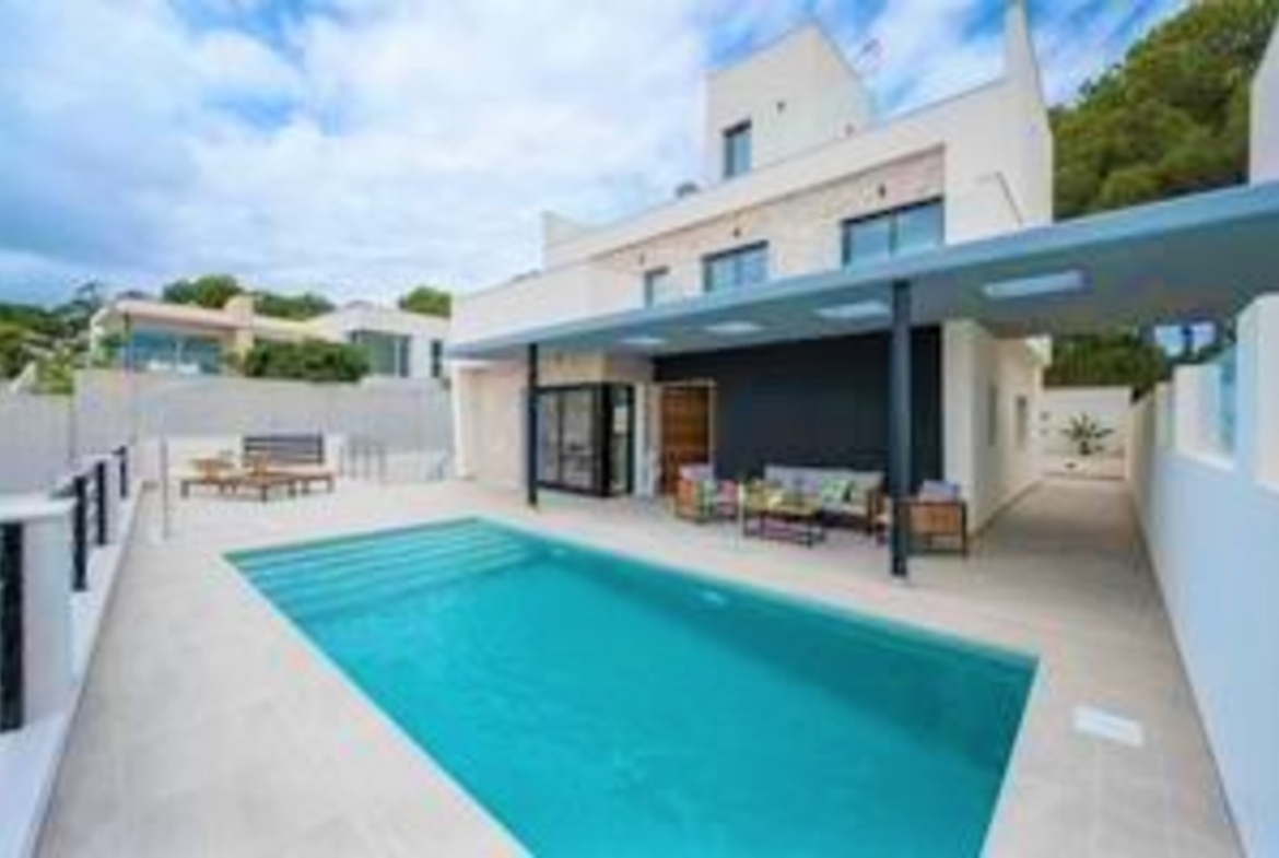 Built in 2021 this stunning villa sits on a huge 520m2 fully landscaped plot with private swimming pool. The thoughtfully designed villa has been built across 3 levels plus the solarium. The ground floor of the property comprises of the living and dining room with the open plan slick kitchen situated towards the rear of the room with independent laundry and utility room with direct access outside of the villa to the terrace and garden. You will also find one bedroom and one guest bathroom. An internal leads upstairs where you will find two master bedrooms both with en-suite bathrooms and access to private sun terraces. The property also boasts a fully equipped basement which also provides 2 additional bedrooms and 2 bathrooms. The villa is located in the sought after location Los Balcones just minutes from the famous salt lakes and Mediterranean sea – views can be enjoyed from the solarium.