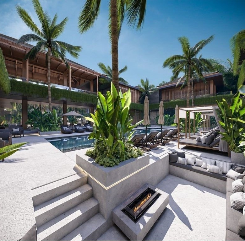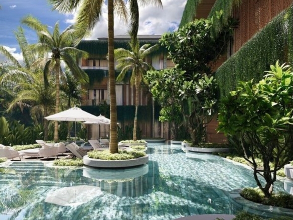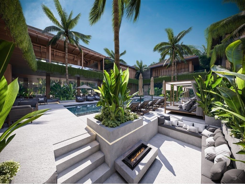 The development offers a full suite of on-site amenities including a fitness club, restaurant and bar, coworking space and a full-service spa with its own pool and relaxation area, all framed by tropical landscaping. The building’s modern architecture is complemented by a traditional Balinese entrance with stone carvings, covered balconies and secure parking provisions.