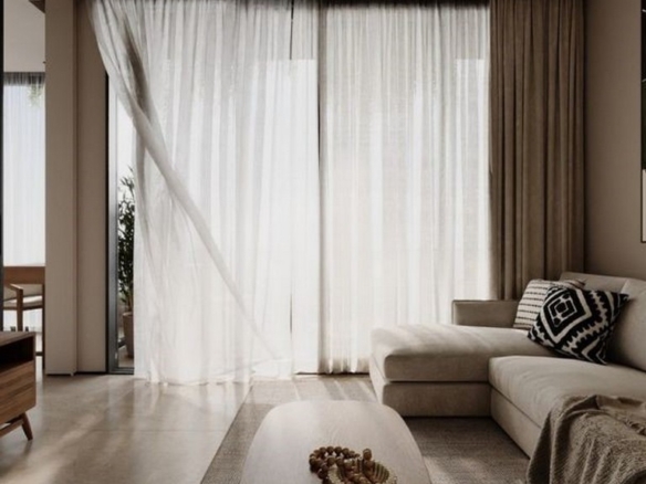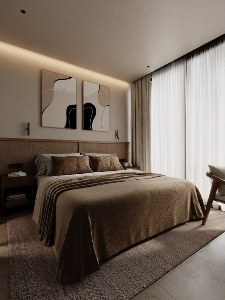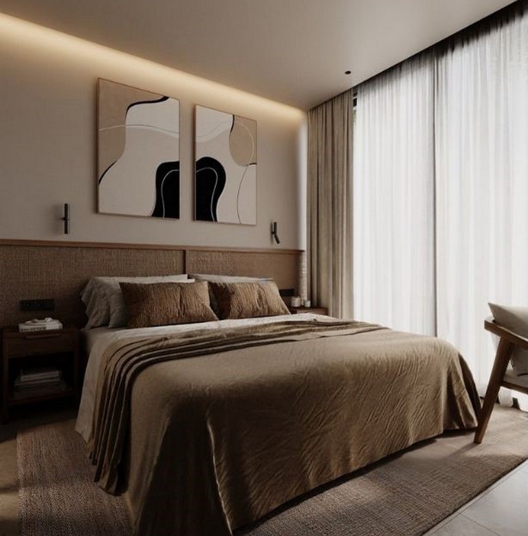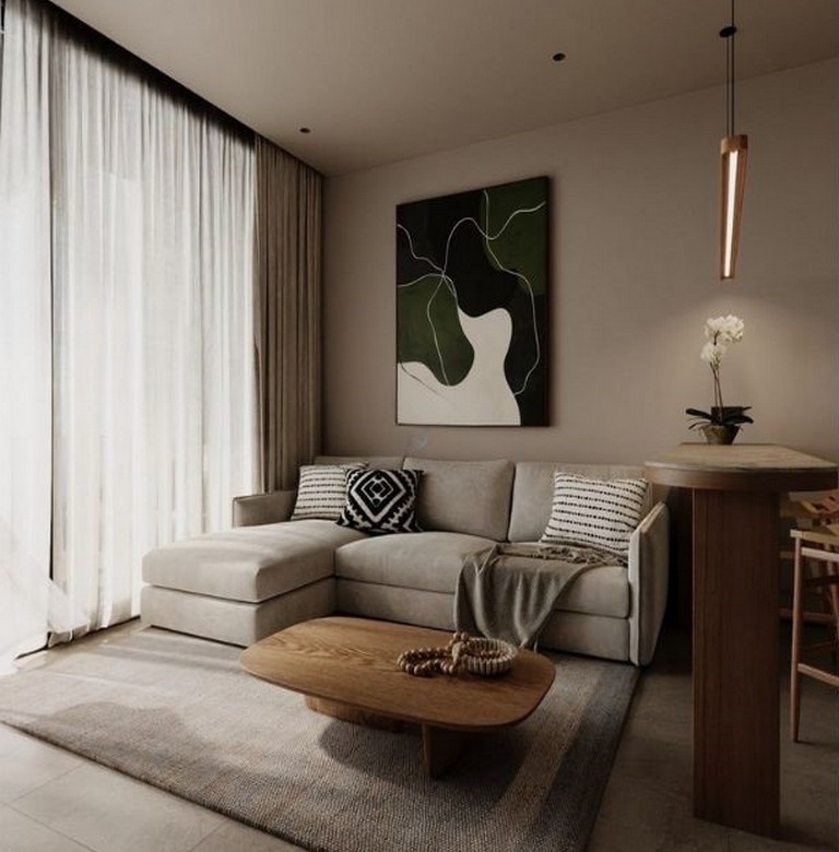 The interior layout emphasizes a seamless indoor–outdoor flow: an open-plan living room and kitchen open to a private terrace, creating a bright, airy atmosphere. Finishes are warm and restrained — light wood cabinetry and shelving, a marble countertop at the kitchen island with two wooden bar stools, ambient shelf lighting, a round wooden coffee table and a light-coloured sofa with textured throws. The separate bedroom is a calm retreat with a large bed dressed in brown and beige tones, abstract artwork, sheer curtains admitting generous natural light, and a dedicated workspace adjacent to a walk-in closet fitted with wooden shelving and woven storage baskets.