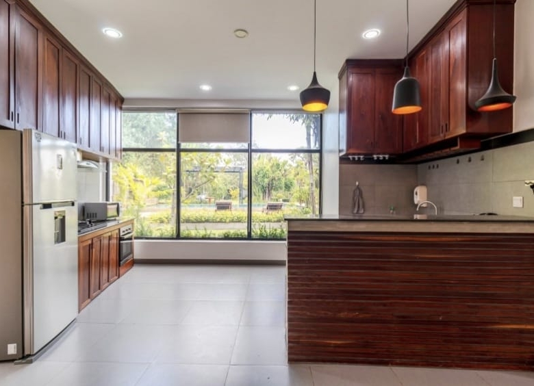 Kitchen: Fully equipped with sink, cooker, oven, exhaust, pantry, and utility counter. A tri-panel glass window provides views of the pool and lawn while filling the space with natural light.