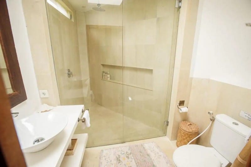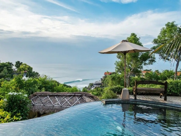 Floor-to-ceiling glazing in every bedroom and living space frames vistas of jungle-topped headlands and crystalline swell lines rising onto Suluban Beach.