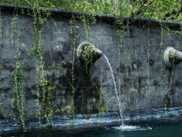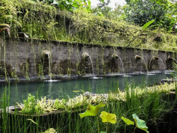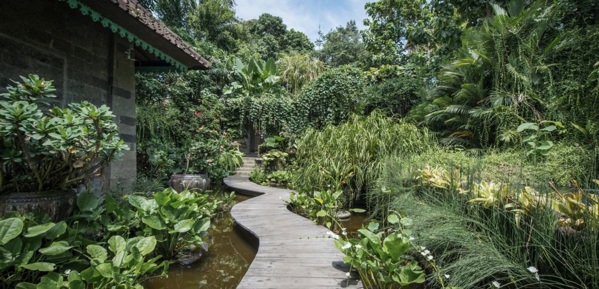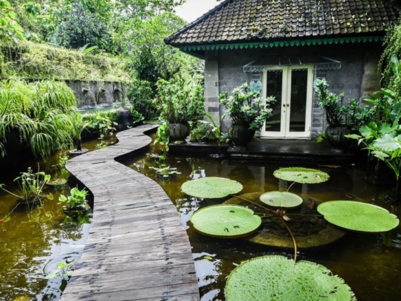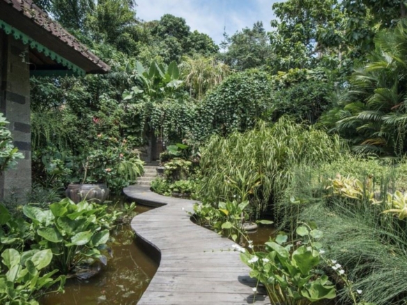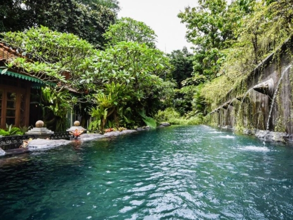 The impressive teak and bronze studded entrance doors mark the beginning of a journey into this amazing property passing a 30-metre spring water swimming pool, adorned with carved fountainheads reminiscent of Tirta Empul Temple. Two stone lions guard a curving walkway flanked either side by water-lily ponds. Going down the 42 hand-carved steps will take you to an open veranda which seamlessly transitions into the natural landscape.