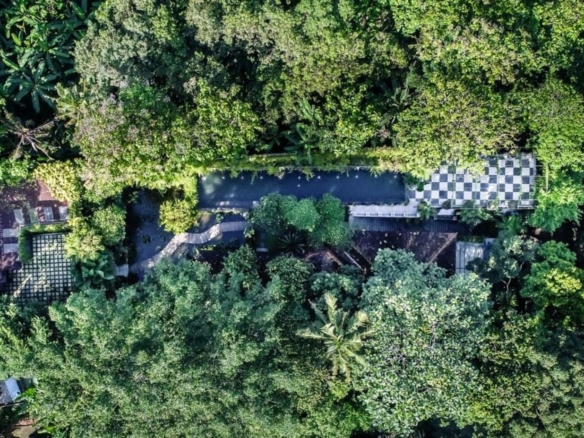 Visitors to this majestic property are in awe of the breathtaking panoramic views of an ancient river, framed by towering bamboos and the greenery of giant leafed tropical plants. The property consists of 2 pieces of land on either side of this river coursing through 5 metre walls of aged paras stone, the two sides connected by a romantic 12-metre bridge featuring steel art deco railings and carved columns. With a bridge view of tumbling rapids on one side, the other sees the river spreading out into a lazy crawl, creating relaxing water sounds with no signs of trash on the riverbed.