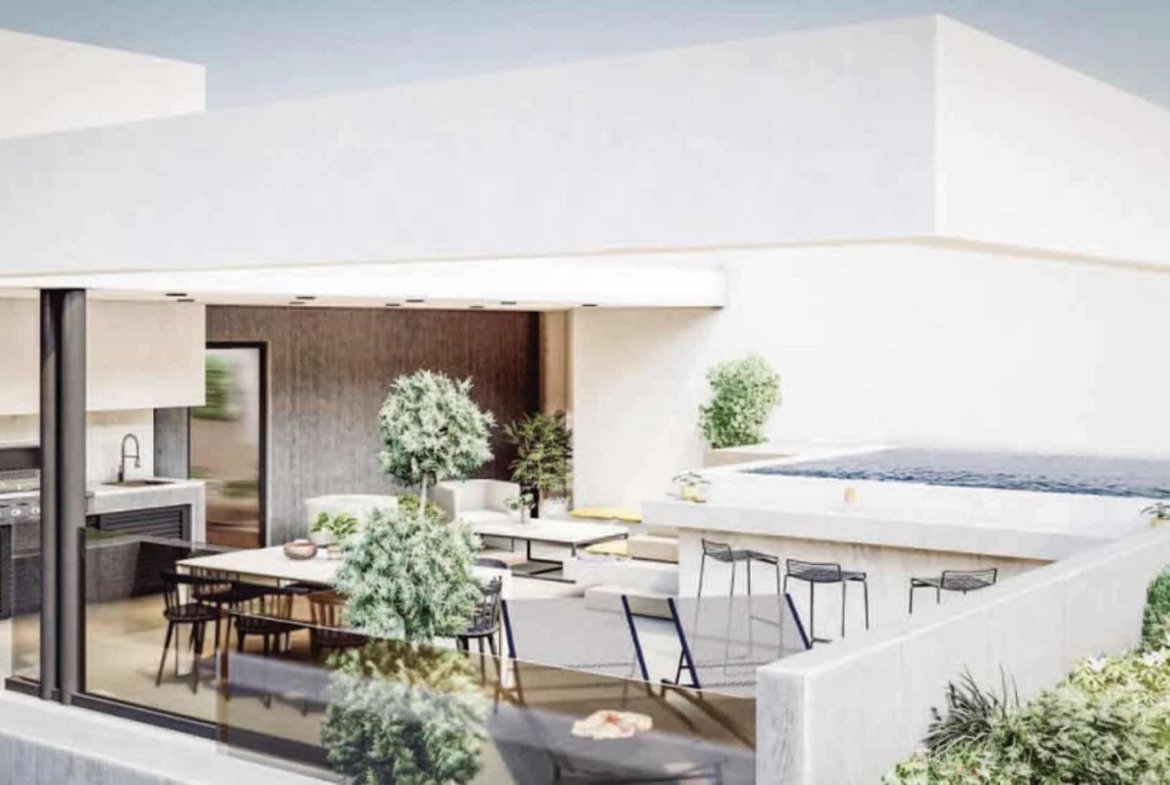 Situated in the urban area of Ayios Athanasios in Limassol, Cyprus. This is a three-story building. This two bedroom penthouse apartment provides luxurious space and a unique open space design. The apartment has a huge roof garden perfect for family and friends gatherings.