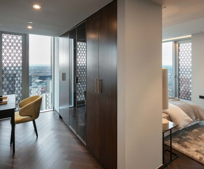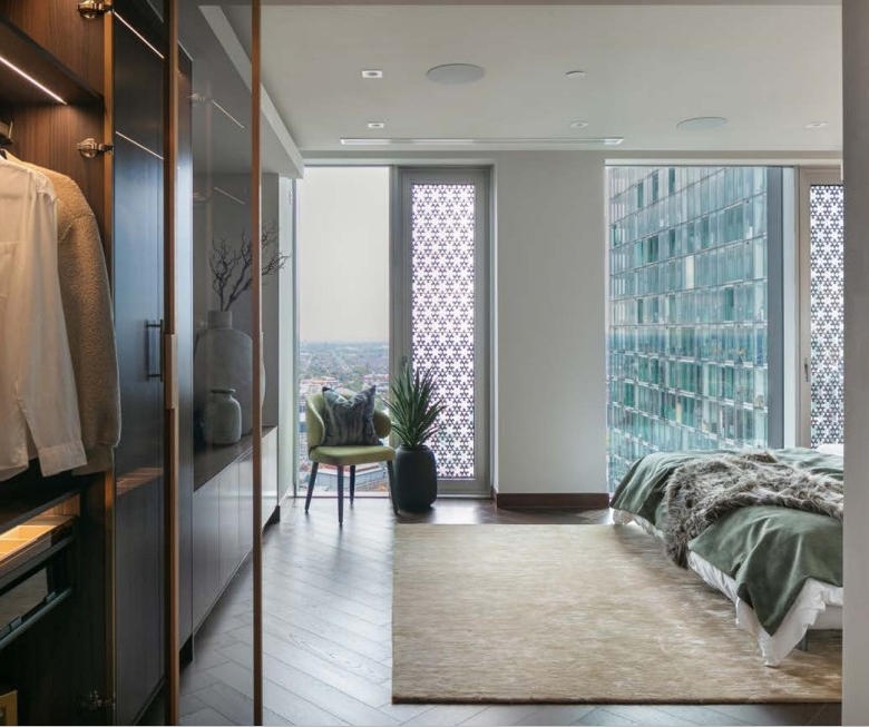 Bedrooms – Tranquil retreats with luxurious Oak Parquet flooring, serene wall finishes, and automated ThermoVeil blinds integrated with the Lutron smart system for privacy and ease.