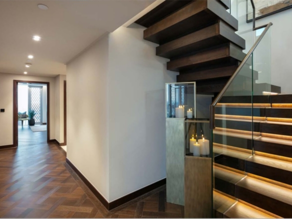 Living Spaces – Elegant interiors with Chantilly Oak Wooden Art Parquet Versailles flooring, designer-selected emulsion paint, and customizable Lutron RA2 smart lighting to create the perfect ambiance.