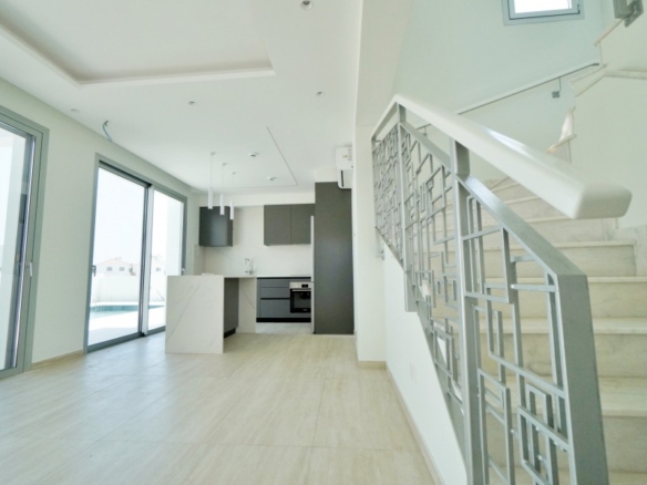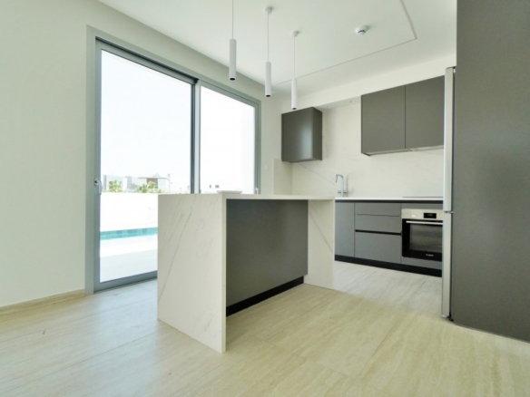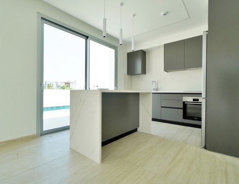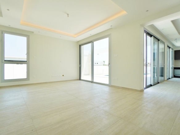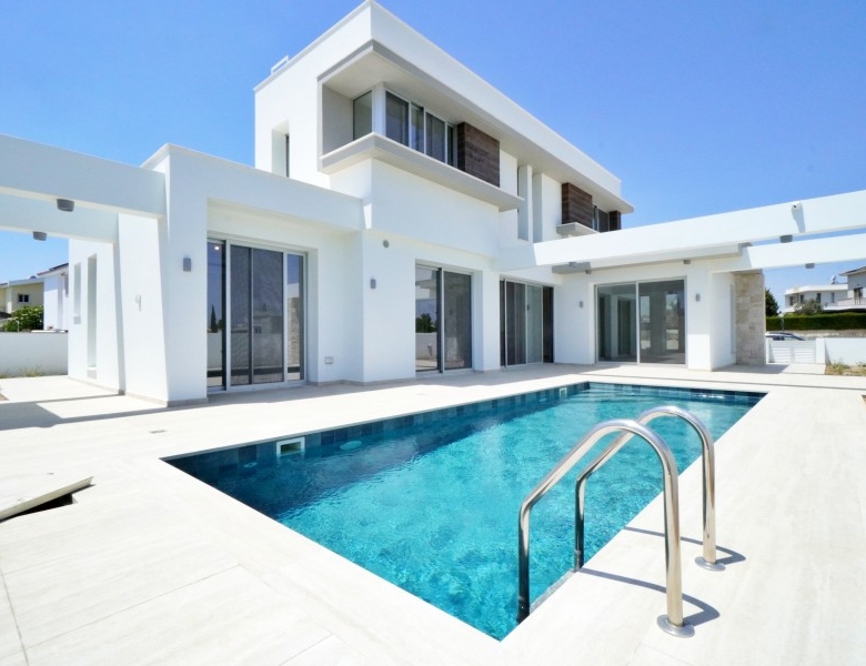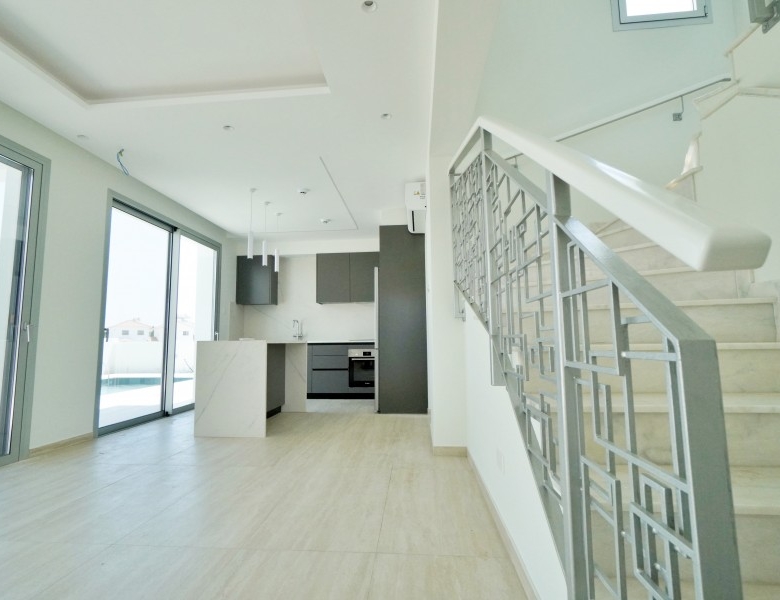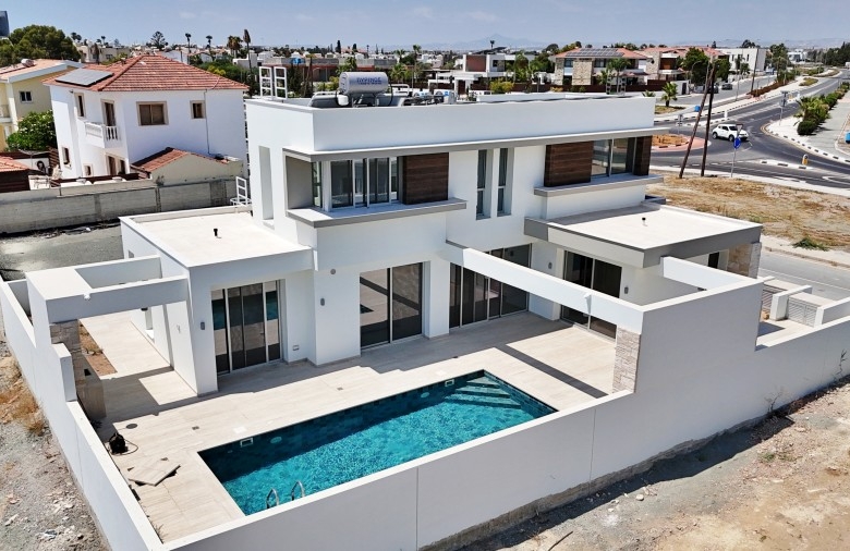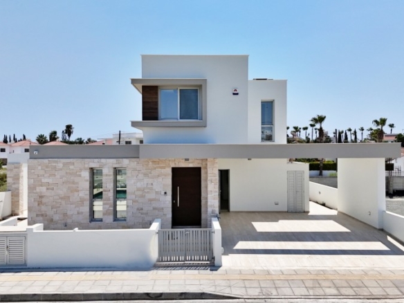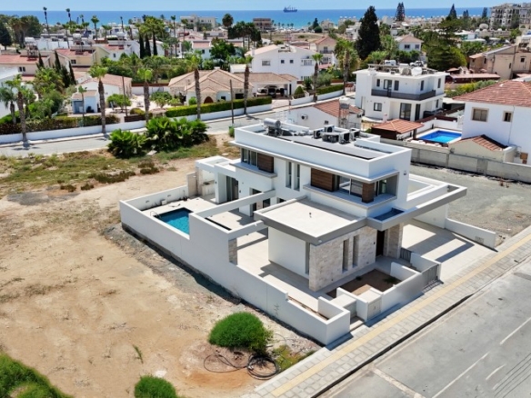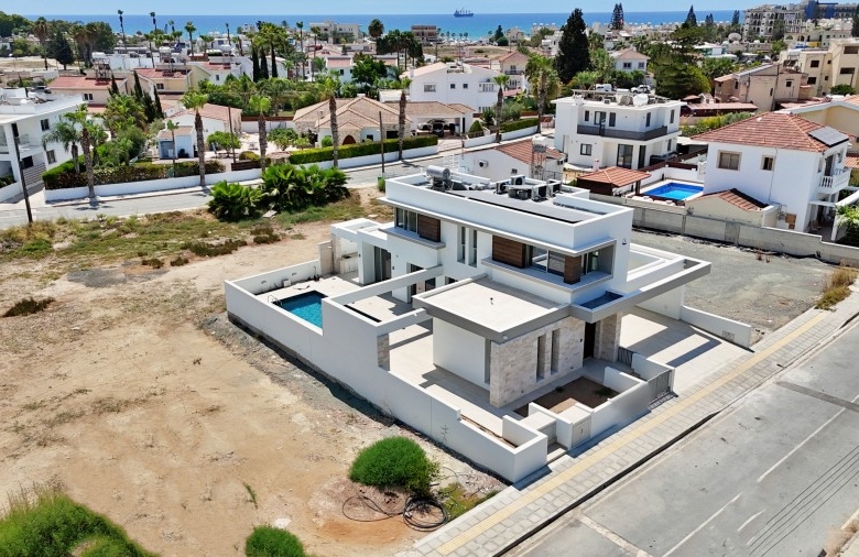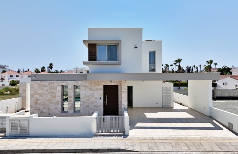 This exquisite modern villa showcases a striking facade with natural stone accents, hardwood highlights, and distinctive roof overhangs. Large full-height windows on the ground floor and waist-height windows on the first floor allow an abundance of natural light while providing UV protection for interiors. The thoughtfully designed outdoor space features a private walled garden with a swimming pool, sun deck, and a stylish outdoor dining area with a bar, perfect for entertaining. A shaded off-street parking area accommodates two vehicles. Inside, the villa offers generous open-plan living spaces, bathed in light and ideal for a warm Mediterranean lifestyle. Large sliding doors seamlessly connect the interior to the sun terrace, pool, and alfresco dining area. High-end fixtures, fittings, and finishes enhance the elegance of the home, while advanced construction techniques, energy-efficient glazing, and premium materials ensure both sustainability and luxury. Conveniently located, this residence is just a short walk from the beach, restaurants, and cafes, with easy access to the town center, major highways, banks, hotels, clinics, and key destinations such as Larnaca Airport, Nicosia, Ayia Napa, Limassol, and Paphos. With three bedrooms, multiple bathrooms, spacious indoor and outdoor areas, and an optional private pool, this villa offers the perfect blend of sophistication and comfort in an enviable location.