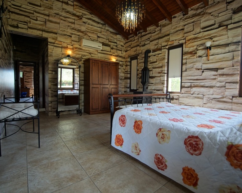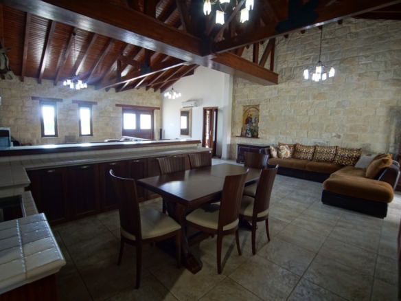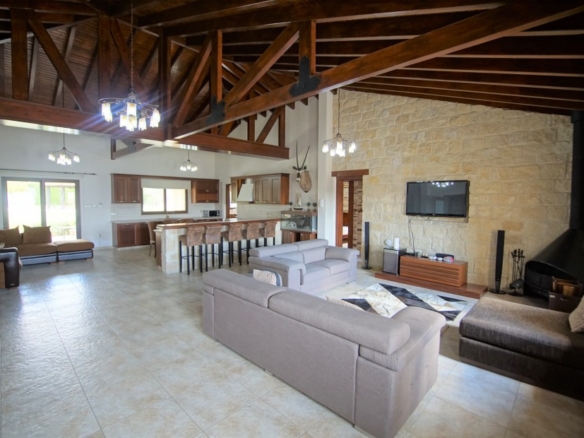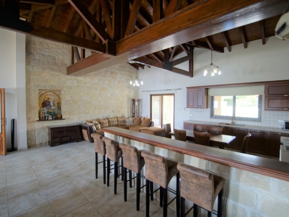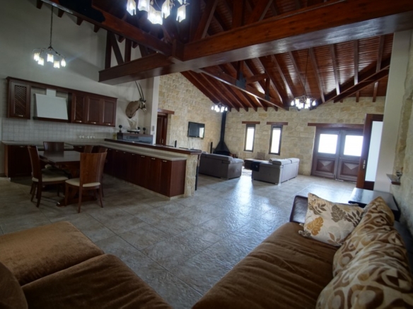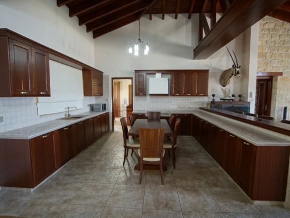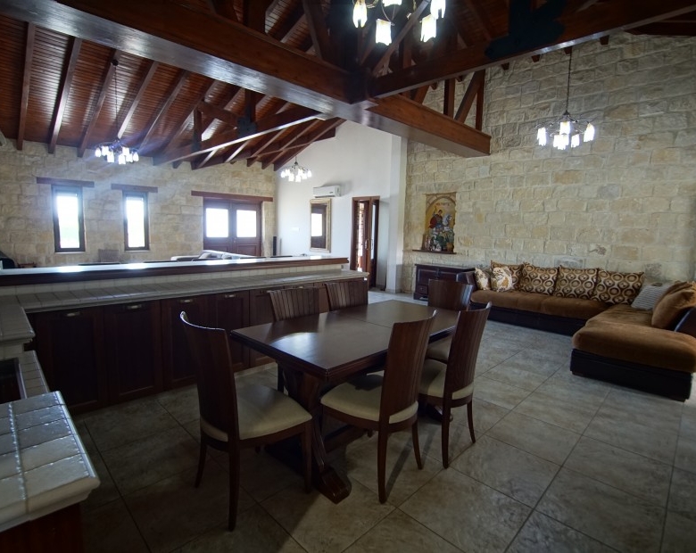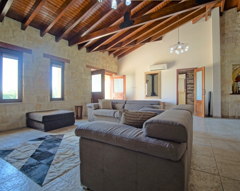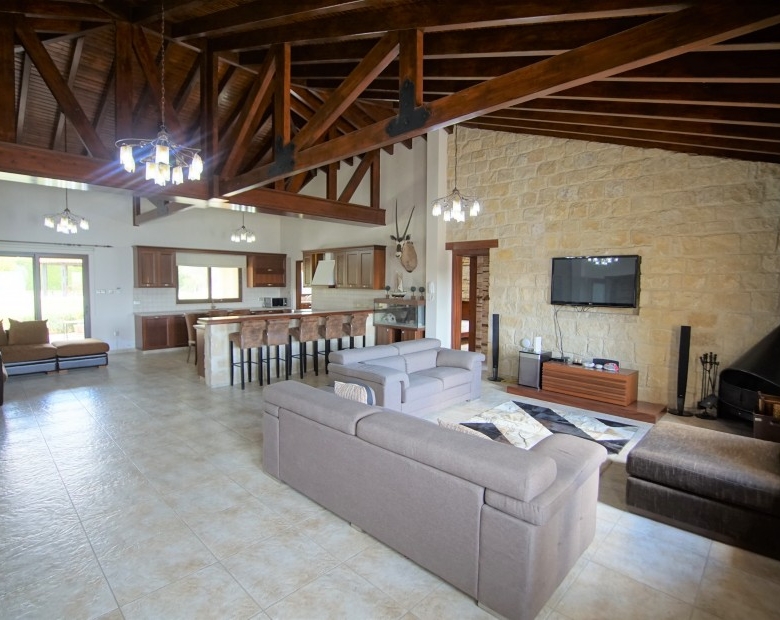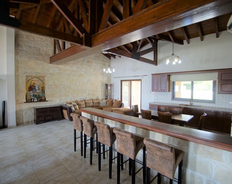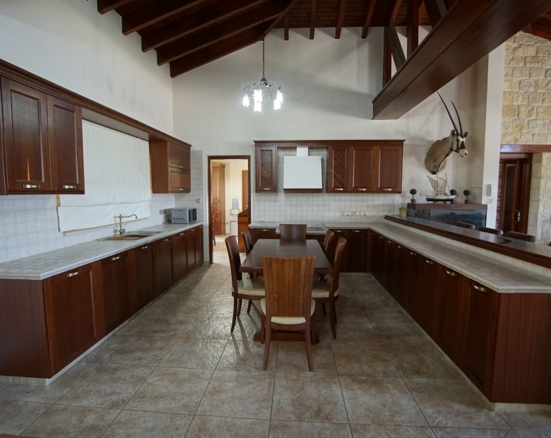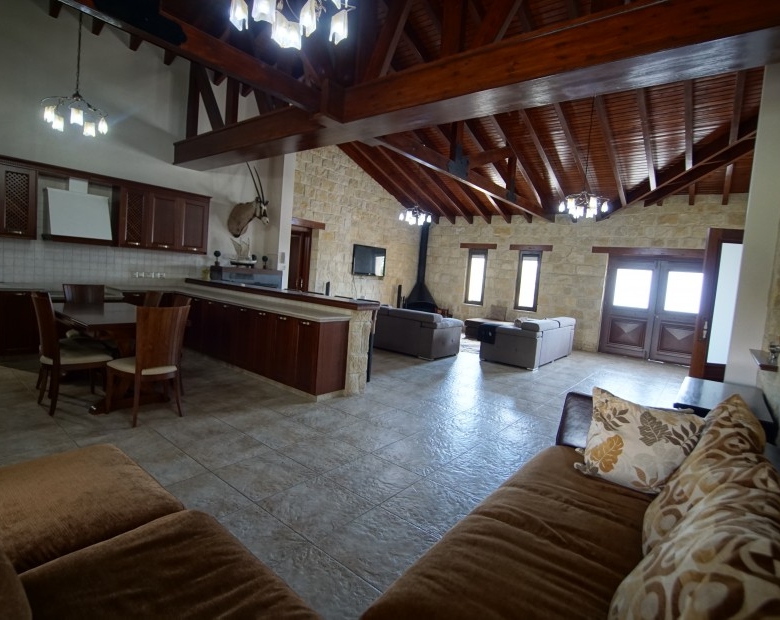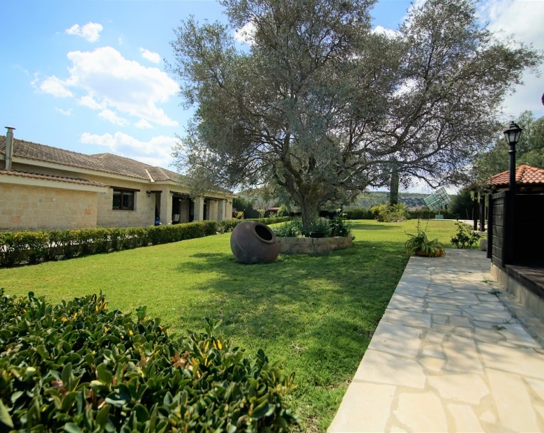 Luxury country style villa overlooking the greens and mountains located in the quiet area of Moni to privilege your seclusion and tranquil living. One level open plan house comprises of 4 good size bedrooms, 2 equipped kitchens, living and dining area, guest house and maids quarter in addition as well as possibility for purchase adjoining plot next to the residence for a bigger area and possibility of built. This ample property lays on a huge plot with a well kept garden and areas for a great living. House space offers a comfortable living and extends to a covered and uncovered verandas from both sides yard and main entrance for the outdoor gathering. It reflects to a thoughtful architectural style to feel the coziness, warmth and beautiful home to be lived in. Spacious private areas outside perfectly meets needs of individuals who appreciates big outdoors facilities like gathering patios, BBQ area, traditional oven area, wooden covered patio surrounded by fruit and olive trees for a comfortable sitting spaces. Great property benefits of a very quiet location, privacy and beautiful designs making it a perfect home !!