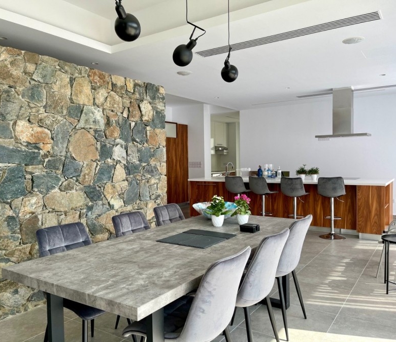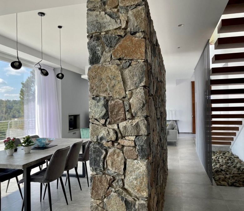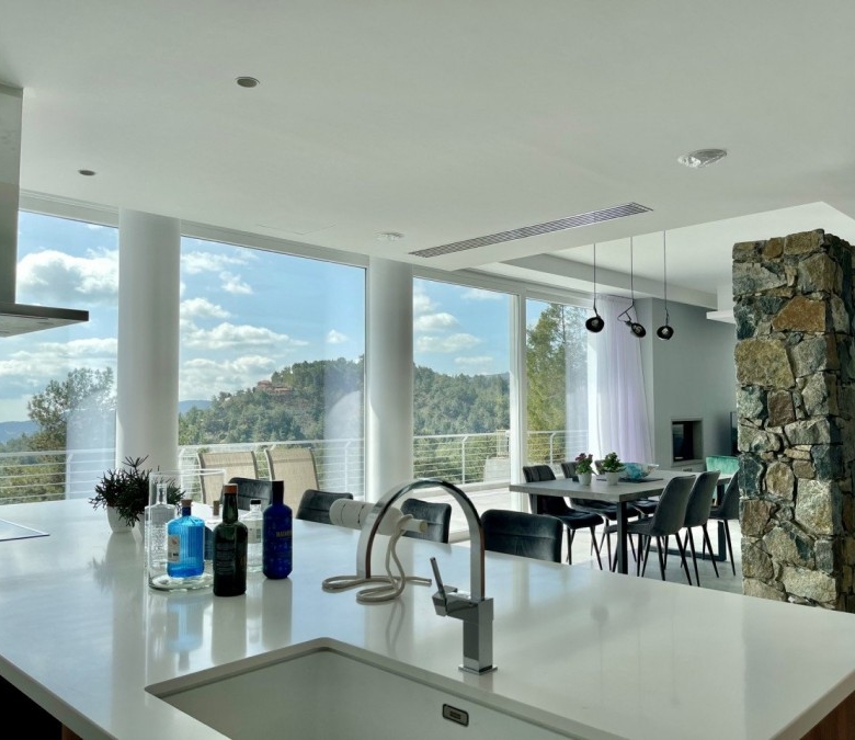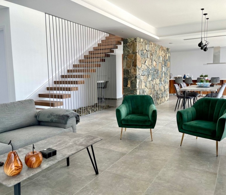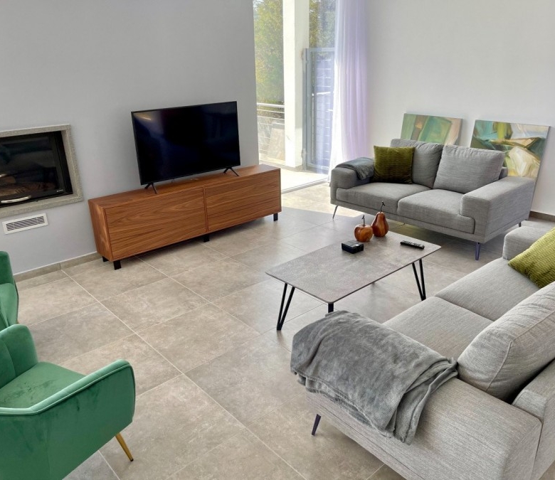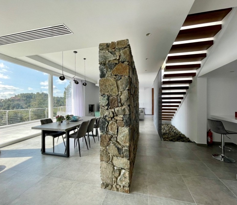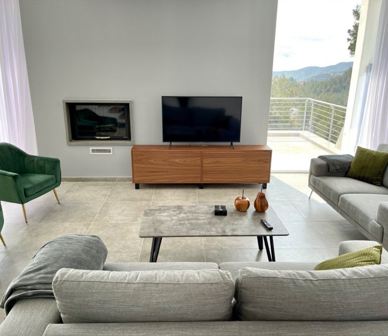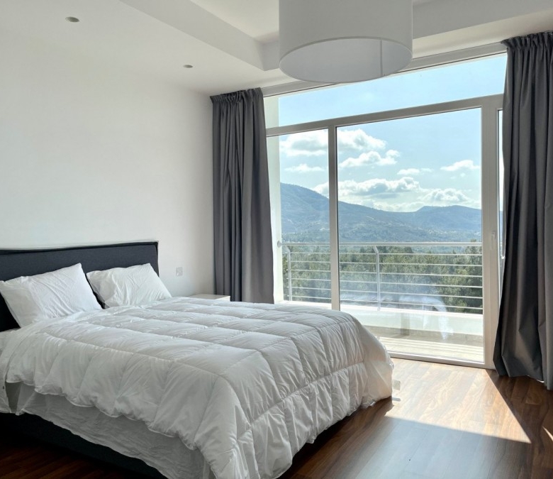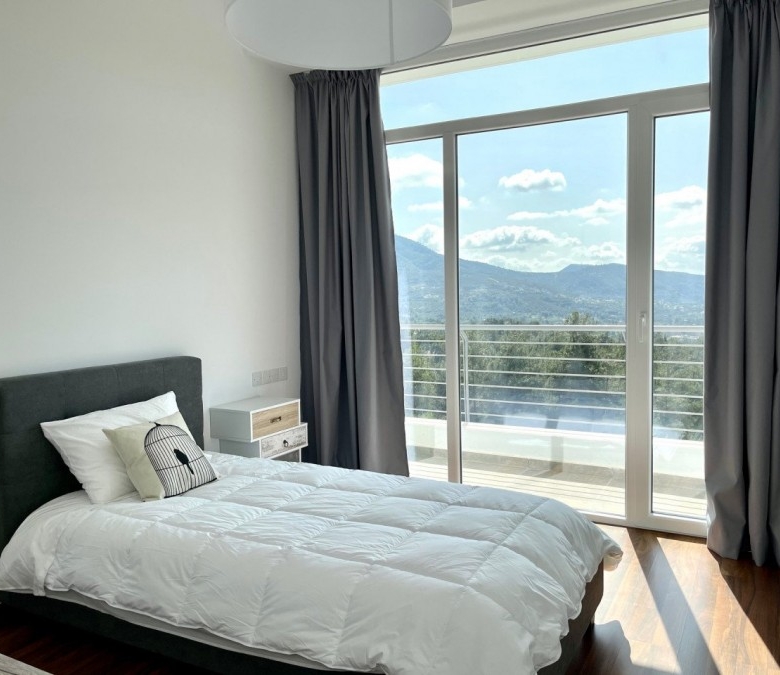 Spacious modern house boasting panoramic mountain views. The house consists of: ground floor – open space living room combined with spacious kitchen and guest toilet. First floor – one spacious master bedroom, office, a common bathroom and 3 more bedrooms with panoramic all with picturesque views.Mezzanine – extra 2 rooms with large sliding doors one of which is with shower and toilet