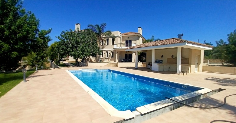 We are proud to be listing this stunning 4 bedroom villa + 1 unit outside with a private pool on a very large plot with amazing countryside views, just minutes drive to Limassol city. The whole plot is a 4349 sqm only has been used approximately 1500 sqm with a garden and the rest remains olive trees and soil. Entering a property there is a big lobby area and three divisions of a sitting, lounge with a fire place area and dining. Big separate kitchen with an area of TV