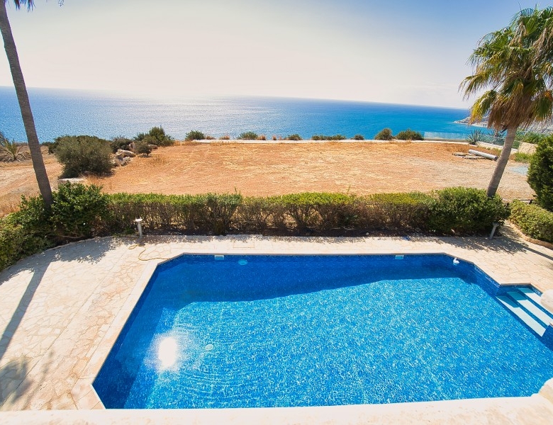 Discover this extraordinary seafront villa situated on Melanda Hill, offering some of the most breathtaking views in Cyprus. Elevated 20 meters above the sea, the villa boasts uninterrupted panoramic vistas of Pissouri Bay, blending elegance, privacy, and sustainability. The unique sea-front bedroom provides expansive views in all directions, while the guest bedroom offers a private retreat with equally stunning scenery. The spacious living room, bathed in natural light, features high ceilings and floor-to-ceiling glass doors that open to a private patio with magnificent sea views, complemented by dual air-conditioning for year-round comfort. The gourmet kitchen, equipped with high-end appliances and granite countertops, is ideal for preparing meals with ease. Outdoors, the villa offers two dining areas, a large shaded patio, and a spiral staircase leading to a rooftop terrace perfect for evening gatherings overlooking the ocean. The oversized pool, surrounded by a sunbathing-friendly patio, also overlooks the sea, providing both privacy and uninterrupted view.