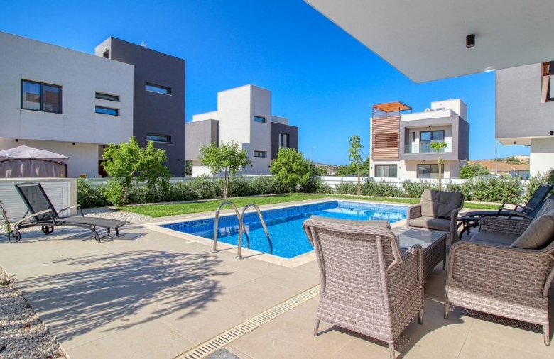 Located in the charming village of Pyrgos, this modern 3-bedroom detached house is part of a friendly complex of private villas, complete with a shared playground, making it perfect for families. Pyrgos offers all the necessary amenities, including taverns, cafes, banks, a post office, and a food market, while being less than 10-minute drive to beautiful beaches, 5-star hotels, and popular beach bars and restaurants. Renowned for its mesmerizing sunrises and sunsets, Pyrgos provides an idyllic setting for permanent residency or a holiday retreat.Set on a 400 m² plot, the villa boasts a private swimming pool and a rooftop terrace of 65 m² , ideal for enjoying stunning mountain and partial sea views. The open-plan ground floor features a spacious living and dining area along with a modern kitchen equipped with high-standard cabinets and wardrobes from European brands. Upstairs, you’ll find three well-sized bedrooms, including a master bedroom with an ensuite shower, and a main bathroom.The home is designed with semi-solid parquet flooring in all rooms, marble floors and walls in the bathrooms, air conditioning in every room, wall-mounted heaters, and thermal aluminum window frames with double glazing. High-quality sanitary ware and fittings from European manufacturers add a touch of luxury to this contemporary home.This property combines modern living with a serene village setting, offering a perfect balance of tranquility and convenience. Whether as a family home or a holiday getaway, this villa is a great opportunity in one of Limassol’s most charming locations.