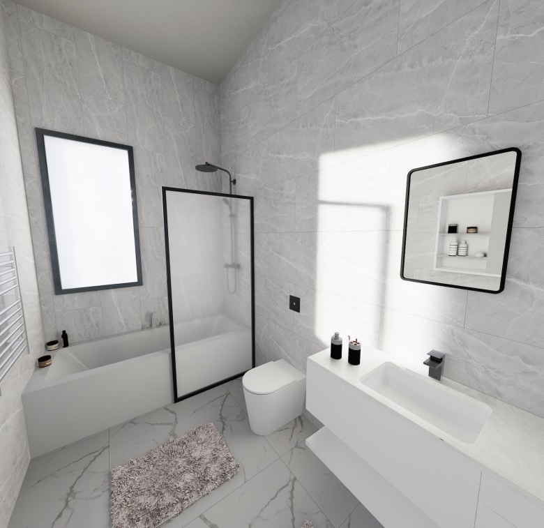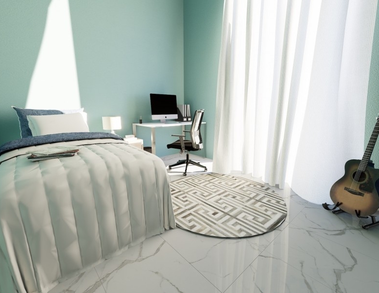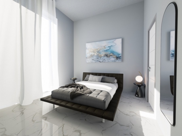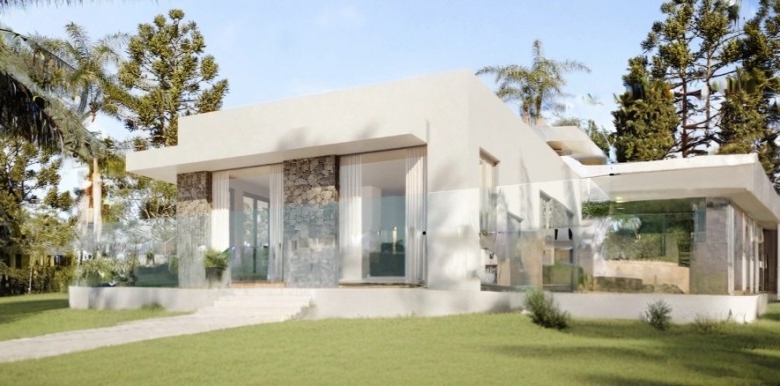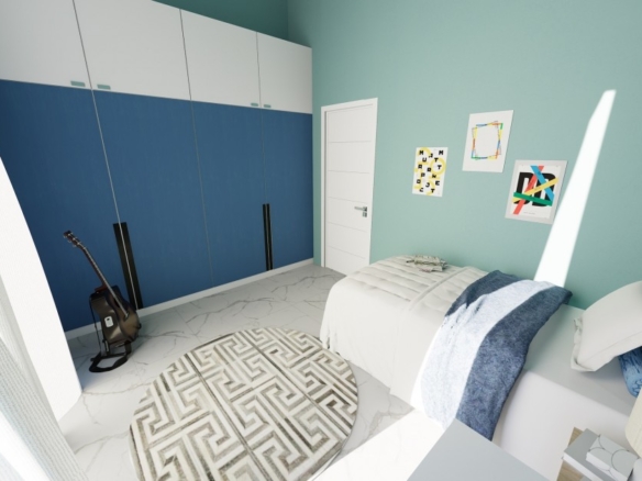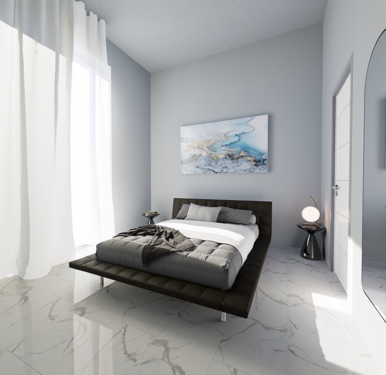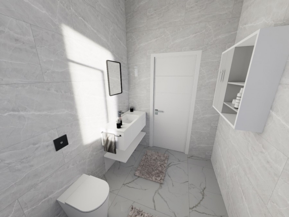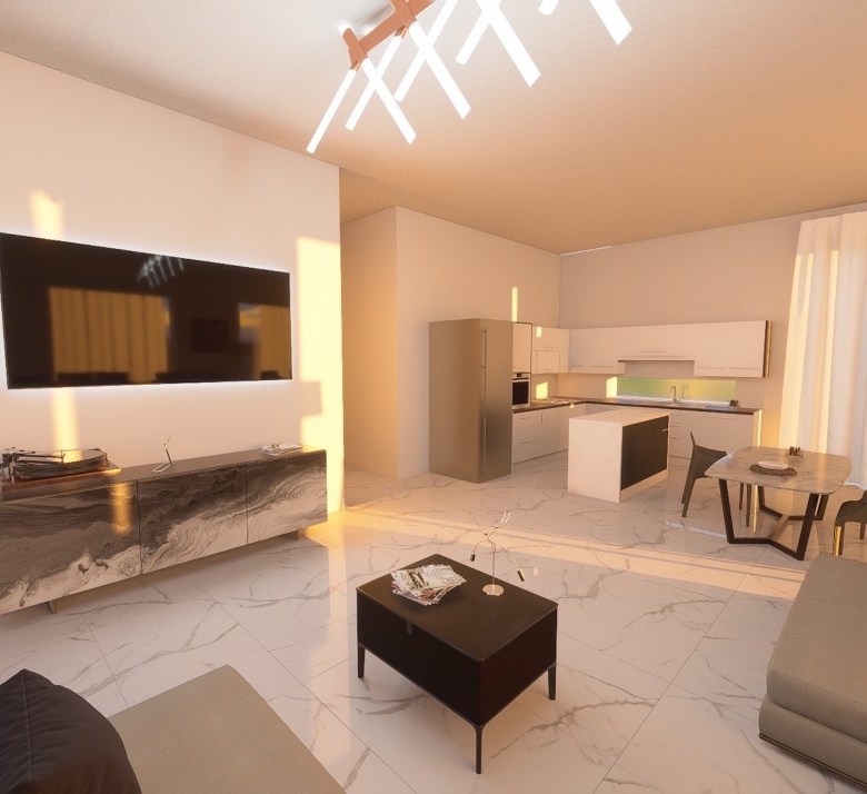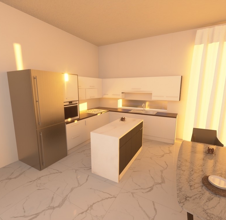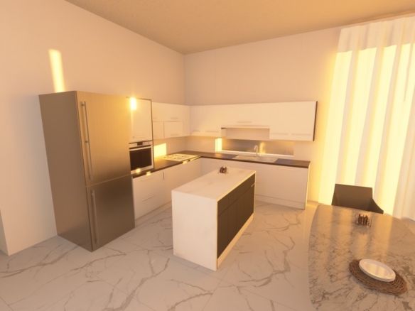 The bungalow features the same open plan layout spanning a single floor. There are 3 bedrooms with 1 bigger bedroom en-suite, two smaller ones for the kids. The biggest room is the combined kitchen-living room, approx. of 50 sq. m. The kitchen boasts an island and a space for a big table for 8 (not included). The living area will have enough space for two sofas and a huge TV (both not included). Both areas have windows all around, including a cooking area. Included in the price: kitchen and wardrobes, as well as heated floors and photovoltaics.