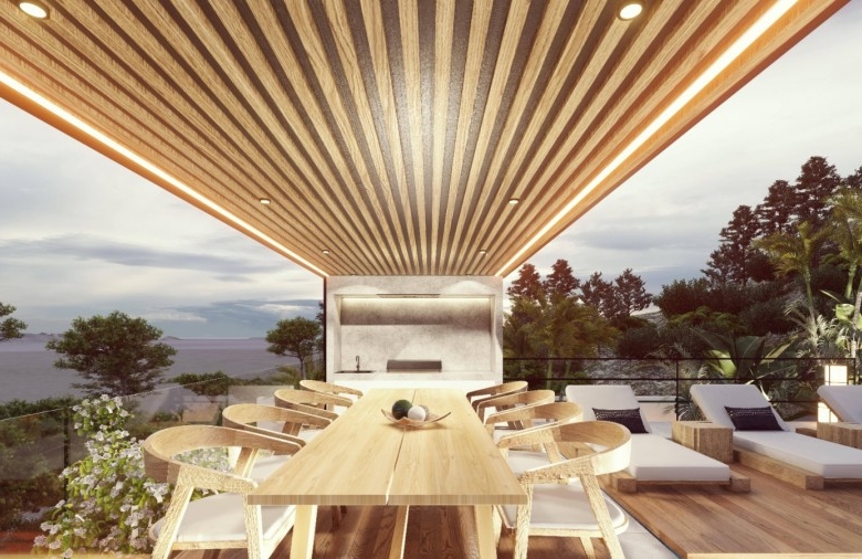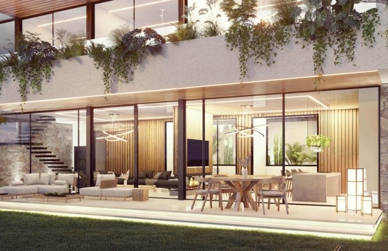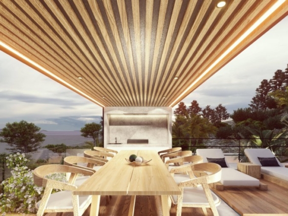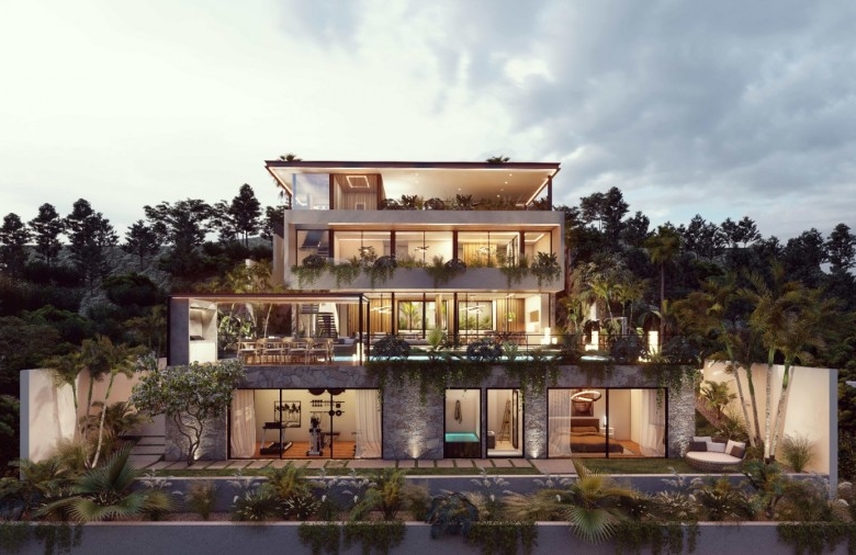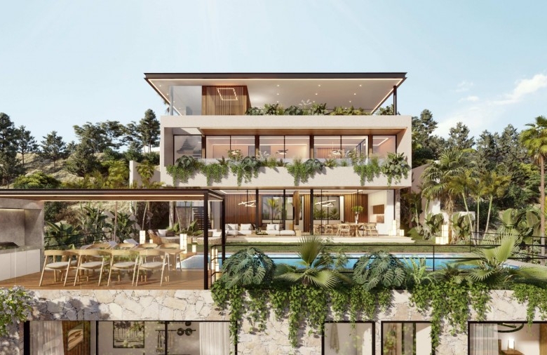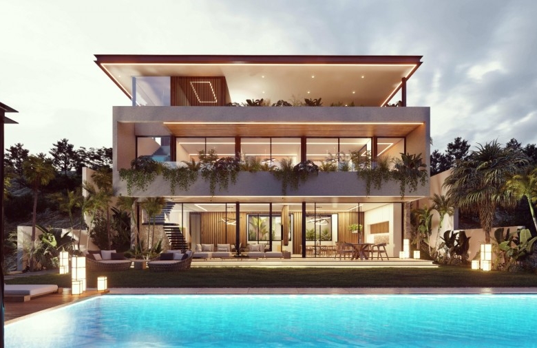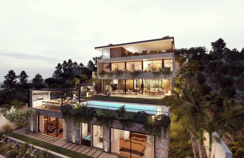 This villa is a well-designed property located in Kefalokremmos, Germasogeia. A really unique location with brand-new homes, great infrastructure, and tranquil surroundings just a minute’s drive from the roundabouts. Excellent area for families that are looking to live in a safe and clean environment that pleases the eye. Most probably the nicest area in Limassol for villa development. The 40% density of the area assures that only private homes can be built. This villa has a total of five en-suite bedrooms; three of them are located within the main building and include a beautiful, spacious master bedroom, one bedroom studio on the top floor, which can be used for the main, and on the outer, lower level, a one-bedroom guest studio. The villa enjoys 3.60m net ceilings with top to floor thermo-isolated aluminum system windows, an open-flow steel & wood staircase, a lift for 8 people, a large office, a gym and a sauna with landscape views, a large living room with a modern fireplace, a kitchen with a dining area and a huge island bar as well as a kitchenette. The swimming pool is 14 meters long and it’s covered with turquoise tone-color tiles. Due to the geomorphology of the plot, the architect designed the property inspired by similar hillside-styled Californian properties.