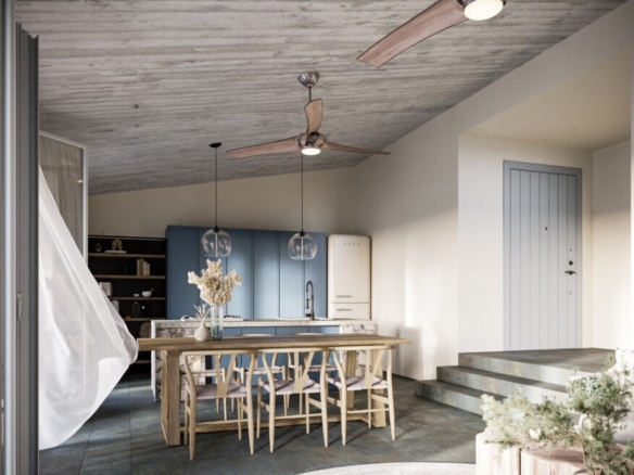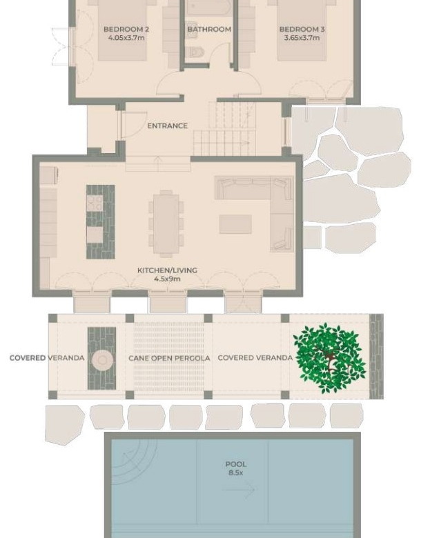 This villa is characterized by a private and spacious master bedroom suite on an upper floor with two private verandas. On the ground floor there are two further bedrooms separated from the living volumes via a welcoming entrance. The open plan kitchen and interior living space naturally flow to the spacious outdoor veranda which is softly shaded by natural materials and indigenous plants.