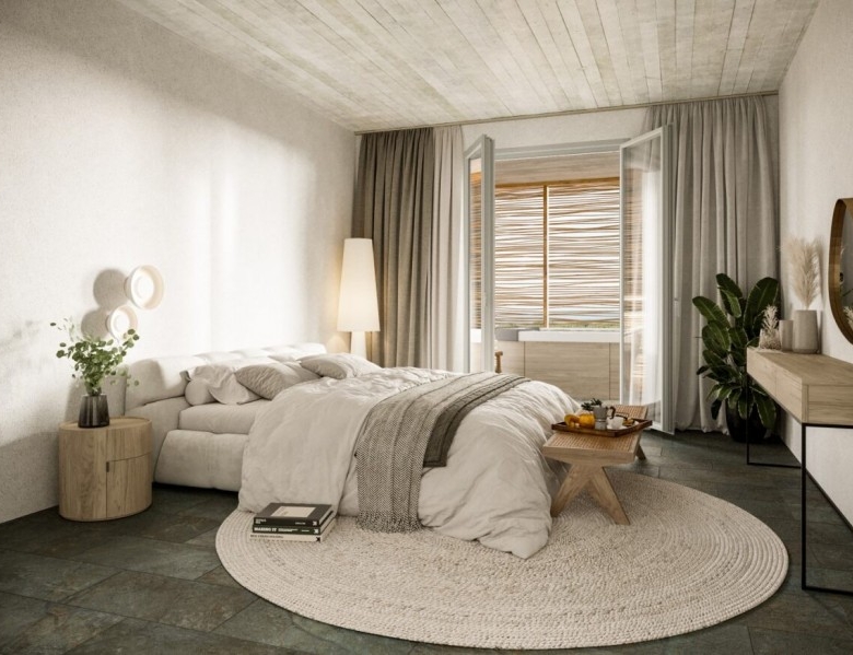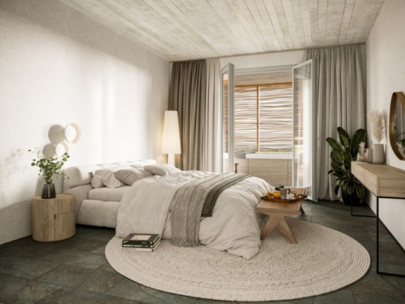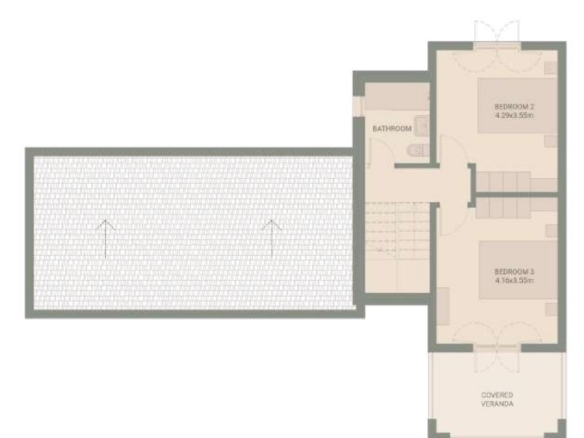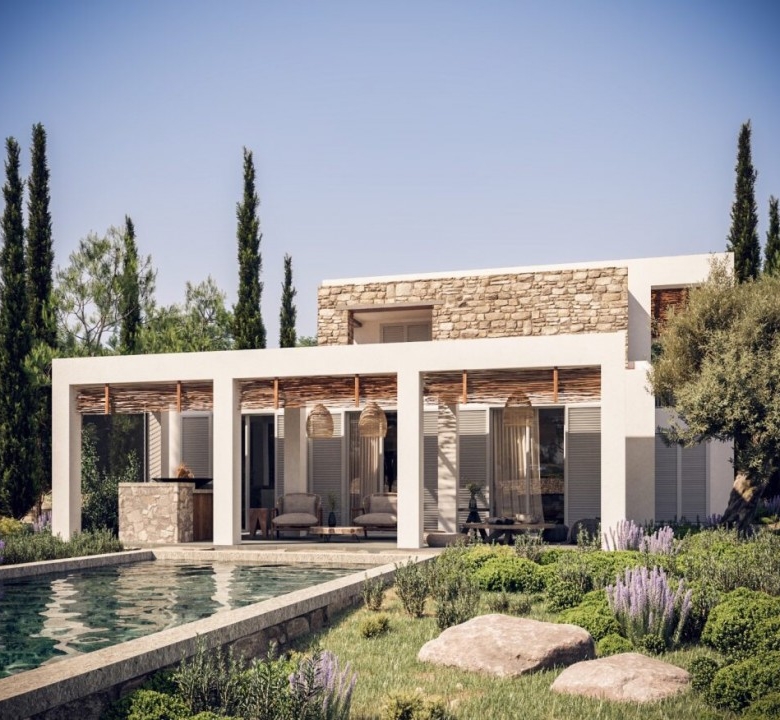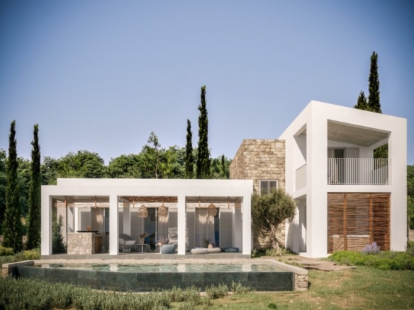 This two story villa embraces a more traditional Cypriot layout with the main bedroom suite on the ground floor leading to a private covered veranda, perfect for a jacuzzi. Upstairs there are two further bedrooms ideal for guests privacy. On the ground level the open plan living and dining area opens via three large patio doors to reveal the outdoor living space and pool area.