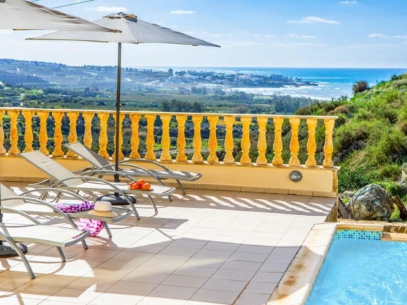 This attractive villa is situated in the fashionable area of Potima and boasts panoramic views of Paphos coastline and to the location of the new marina. Offering spacious family accommodation to the highest of standards, the villa comprises of 3 double bedrooms, 3 bathrooms, large open plan living area and Italian styled kitchen with granite worktops. Externally, the villa enjoys a large roof terrace with stunning views, landscaped garden and infinity swimming pool. Pegia village offers a wide variety of shops, local taverns, bars and restaurants. Coral Bay with its blue flag sandy beach is a few minutes away, whilst Paphos town and ancient Harbor is a 15 minutes along the coastal road.