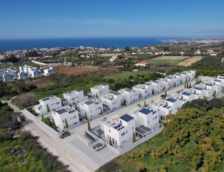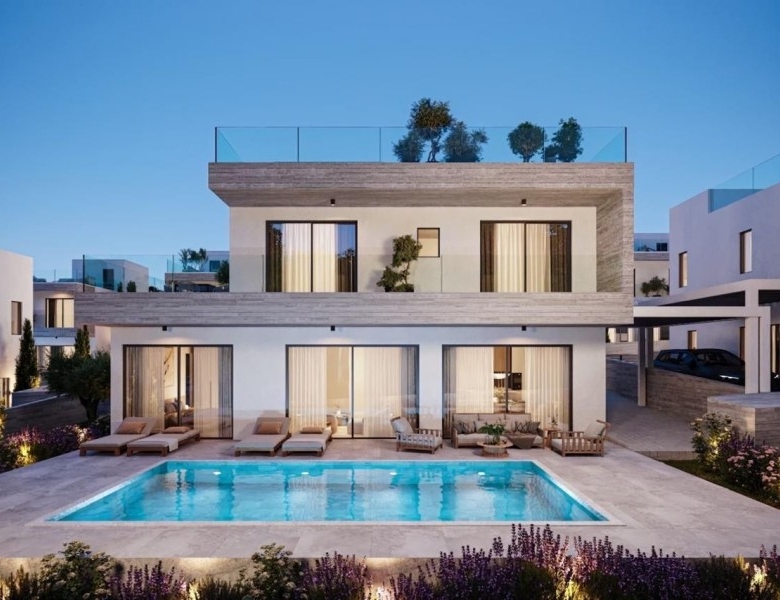 This unique villa in Kissonerga Village on the outskirts of Paphos features impressive modern architecture with spacious and comfortable areas in green surroundings. This breathtaking three-bedroom villa, within walking distance of the beach and many local amenities, combines simplicity and practicality and offers scenic views of the Mediterranean Sea.Delivery – 18 months.