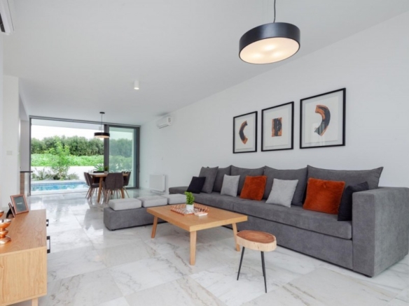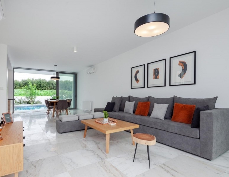 The 3-bedroom 3 bathroom villa offers a private outdoor pool,a well maintained garden, gorgeous interiors in a unique space. As you enter you will find yourself in a modernly furnished living area, which glass patio doors will lead you to terrace where al fresco dining can be enjoyed whilst admiring the mesmerizing views of the garden and pool. Apart of the fully equipped modern kitchen and dining area, the guest toilet is located on this floor. When reaching the first floor via the stairs there are 3 bedrooms. A master bedroom with king size bed, en-suite. Completing the bedrooms on this floor are a further 1 double and 1 twin bedrooms. The outside area can be accessed from the ground floor where you will find the spacious front garden area furnished with sunbeds, outside table and chairs, Cypriot Style BBQ and the private swimming pool.Villa is located in Emba Village. Emba Village is a traditional Cypriot village with a small selection of Tavernas and shops and a beautiful 12th century church. A large supermarket and further restaurants and shops are a 5 minute drive away while the villa is a 10 minute drive away from Paphos with its lively harbor and many cafés and restaurants serving excellent local dishes in a beautiful setting. The blue flag beaches of Coral Bay which offer diving and a range of other water sports are also only a 15 minute drive away. Emba is also home to many chapels and churches, one large church has been recently built and others are very old little chapels. The village is charming with it’s winding roads and lemon, orange and nectarine groves. Agriculture is the main industry of the area and as well as citrus fruits there are also peaches. Emba has a few shops and tavernas dotted along the narrow winding road that runs through the village. In the evening the local men can be seen sitting outside their local coffee shops.
