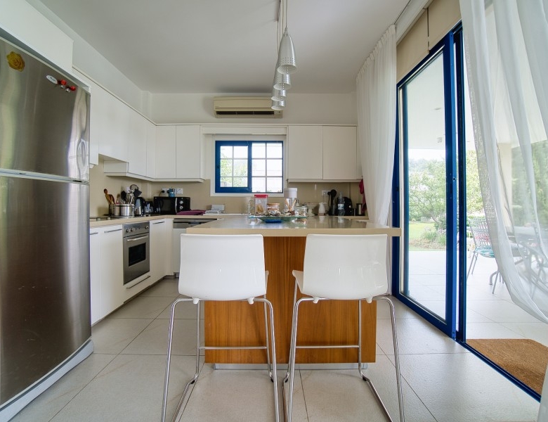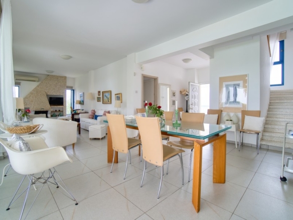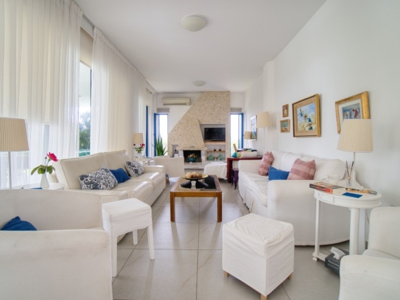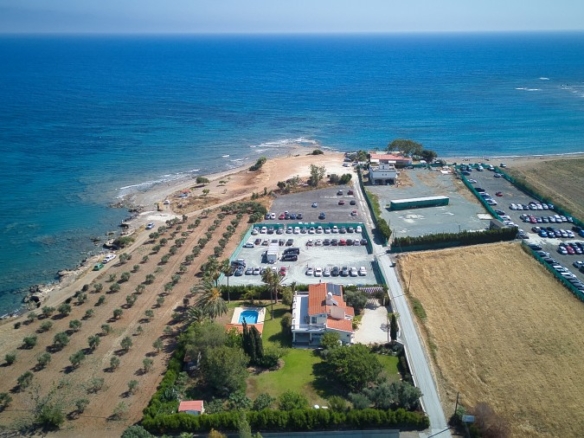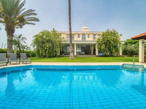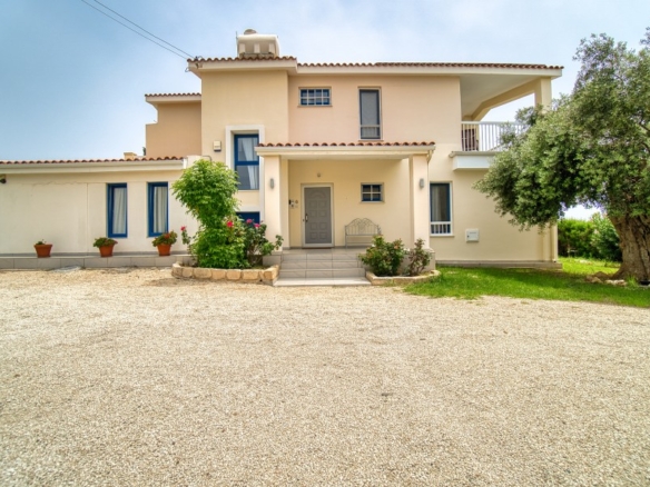 We offer for sale a villa near the Paphos Airport and 50m from the sea. The villa is on two floors. It has 5 ensuite bedrooms, open plan sitting/dining room (with a fire place) and kitchen, guest toilet, an en suite maid’s/laundry room with an independent entrance, large covered and uncovered verandas both on the ground and first floor, with panoramic sea views. It has a solar water heating system, photovoltaic panels, water pressurising system and alarm system. There are a/c units in all rooms. All the doors and windows have aluminium frames and are double glazed. The garden has been designed by a garden designer and it has an automated irrigation system, grass, mature fruit and decorative trees, palm trees, bushes and flowers. It is fenced all around with α high fence. There are two large gates at the front and a drive-in/out and an aluminium pergola with parking space for two cars. It has an 8X10 m swimming pool, with built-in stairs and special anti-slip tiles. Adjacent to the swimming pool there is a 10X5 kiosk , a shower and w/c for the needs of the pool. In the back corner of the garden there is a shed (5X4) and a small gate for an easy beach access. There is a well for the need of the swimming pool and a water supply from the government dam for the needs of the garden.