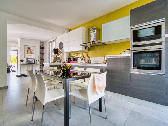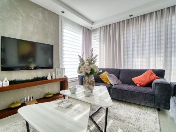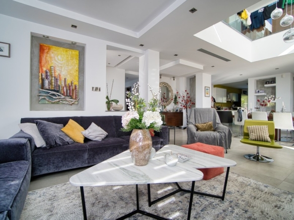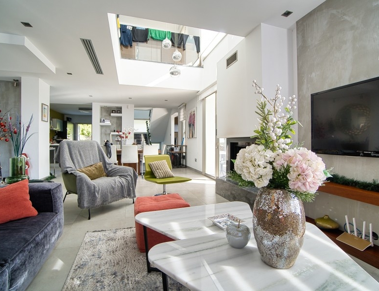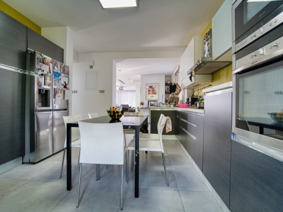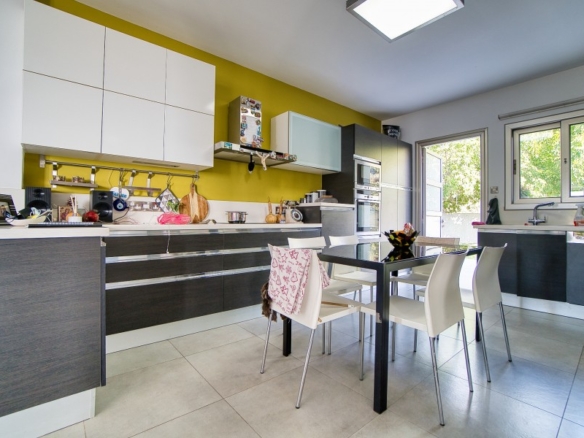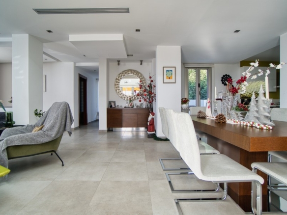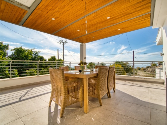 Modern design villa 248 sq.m (covered area) 315 sq. m. total premises area in Tsada, built in a plot of 1619 sq. m. It has stunning panoramic sea and mountain views. Located on the drive up to Tsada, set on a hillside (Olympus). The house is approximately 10 min. drive north of Paphos, 10 min. drive to Tsada Golf Club and 5 min drive to the International School. Its a 3 level property situated at the end of a private road, with a split driveway, one leading to the main entrance and the other to the lower basement area with two-car covered parking, which can be converted into a self-contained apartment. Entering (2nd level), the house has a spacious living/dining room and a second lounge (family room). On the same level there is a study room and a guest WC, plus a large covered balcony with amazing sea view and double access from the dining area and the living/family room. At the back of the house, outside the kitchen, there is a covered patio with al fresco dining and a large garden area and a built-in BBQ. Upstairs there are 3 double bedrooms, full family bathroom, en-suite bathroom in the master bedroom with a corner bath/jacuzzi and a feature cubical shower, walk-in wardrobe and access to another sea view balcony. On the same floor there is a laundry room. At the lower basement area behind the garage port and attached to the property, there is a service/maid or storage room with a WC. At the same level at the very rear of the house, there is a 200 sq.m. landscaped garden with grown up local trees/flowers. Features: Italian manufactured floors-granite worktops, full thermal insulation, underfloor gas central heating, water pressure system and water filter under kitchen cabinet, double glazing, fireplace, utility room, ac units, security system with alarm, photovoltaic system of 7.9 KW, bbq area at kitchen level, permission to construct a private swimming pool, borehole, irrigation system, title deeds. Furniture and electrical appliances are negotiable.