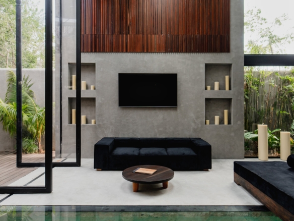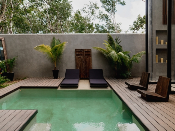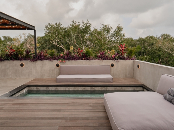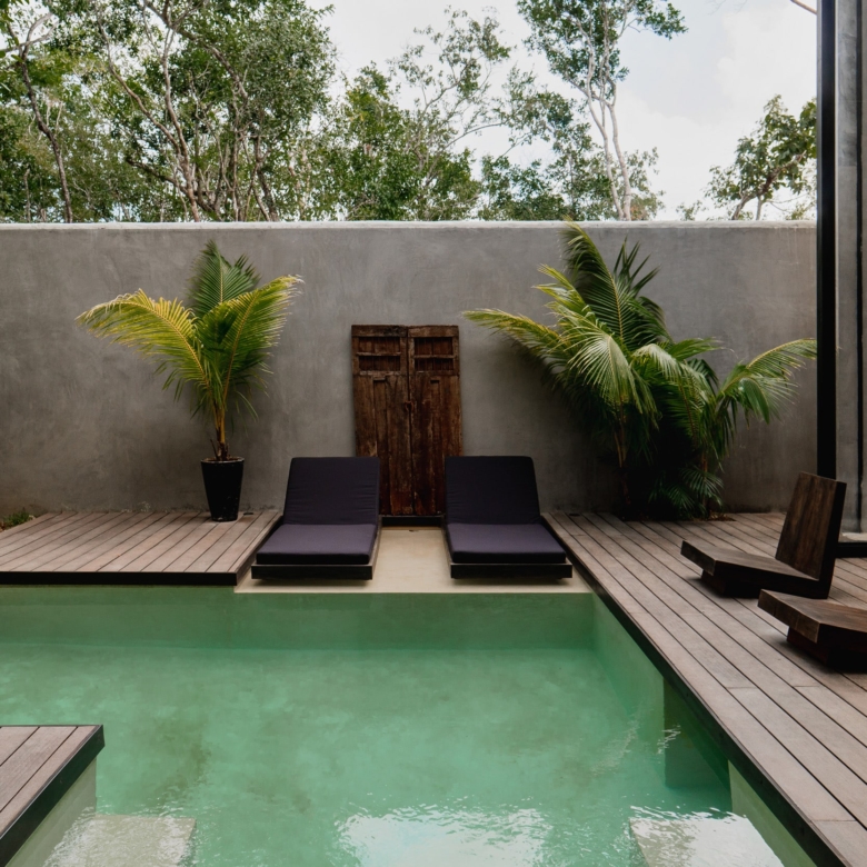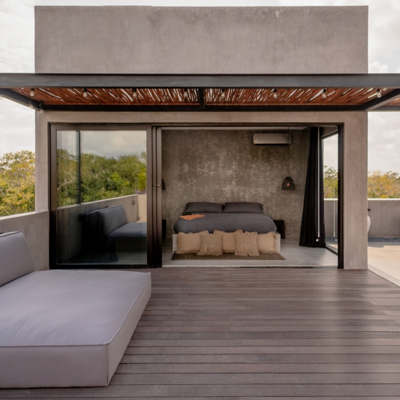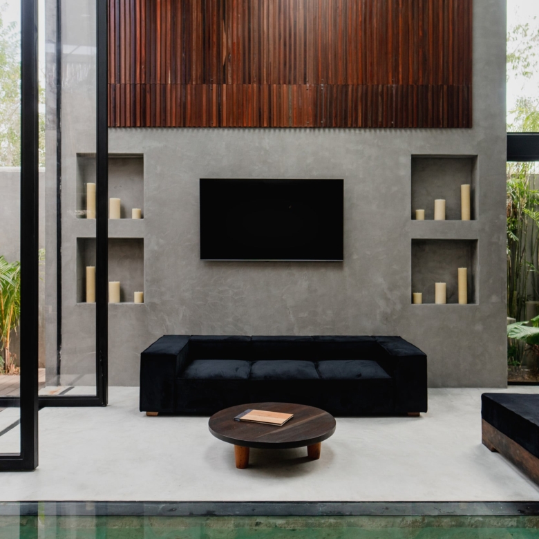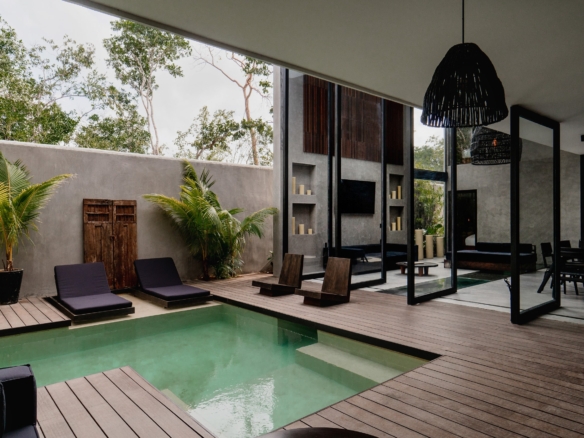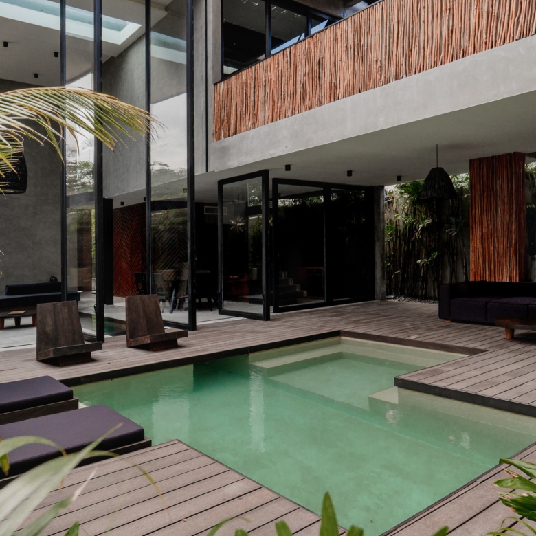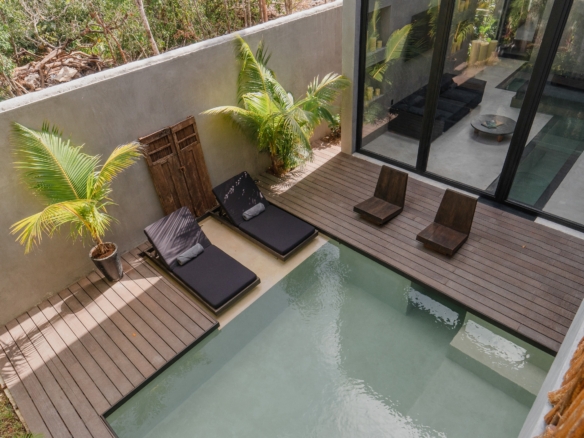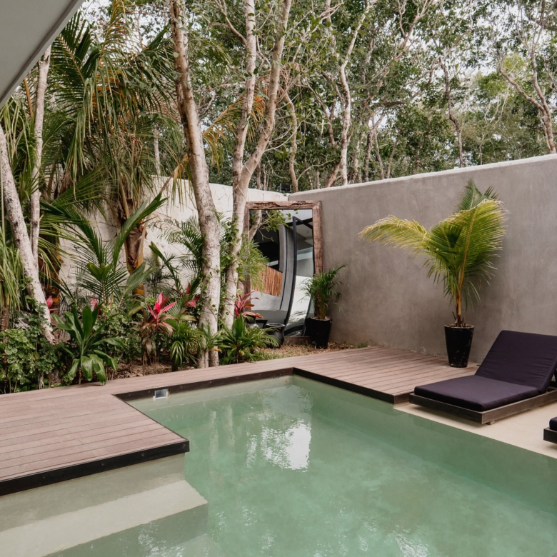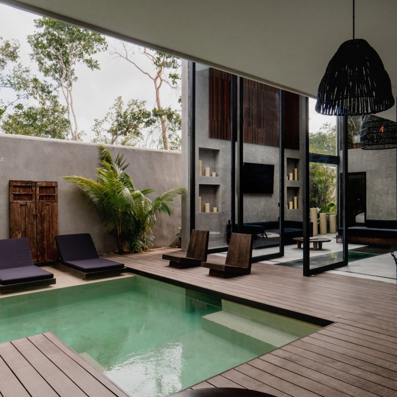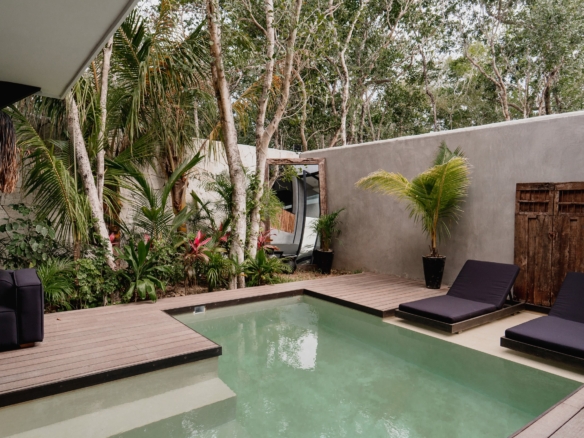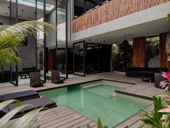 The villa’s design is deeply inspired by the connection between human beings and nature. Its bioclimatic architecture ensures that the home remains cool and comfortable throughout the year, utilizing the natural orientation of the land to maximize airflow and minimize heat absorption. The open-concept layout is centered around a lush courtyard and private swimming pool, allowing every space within the home to enjoy expansive views of the serene outdoor setting. High ceilings and strategic ventilation enhance the feeling of spaciousness, while natural materials such as polished concrete, tzalam wood, and chukum finishes create an aesthetic that is both elegant and organic.