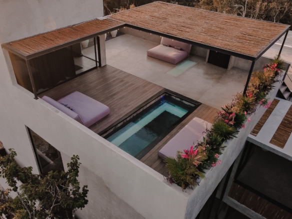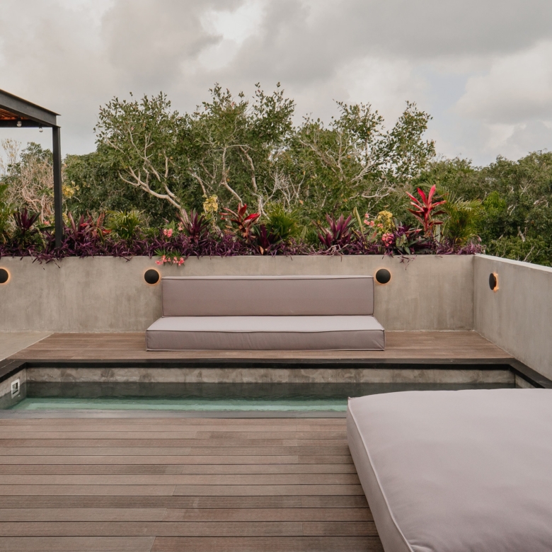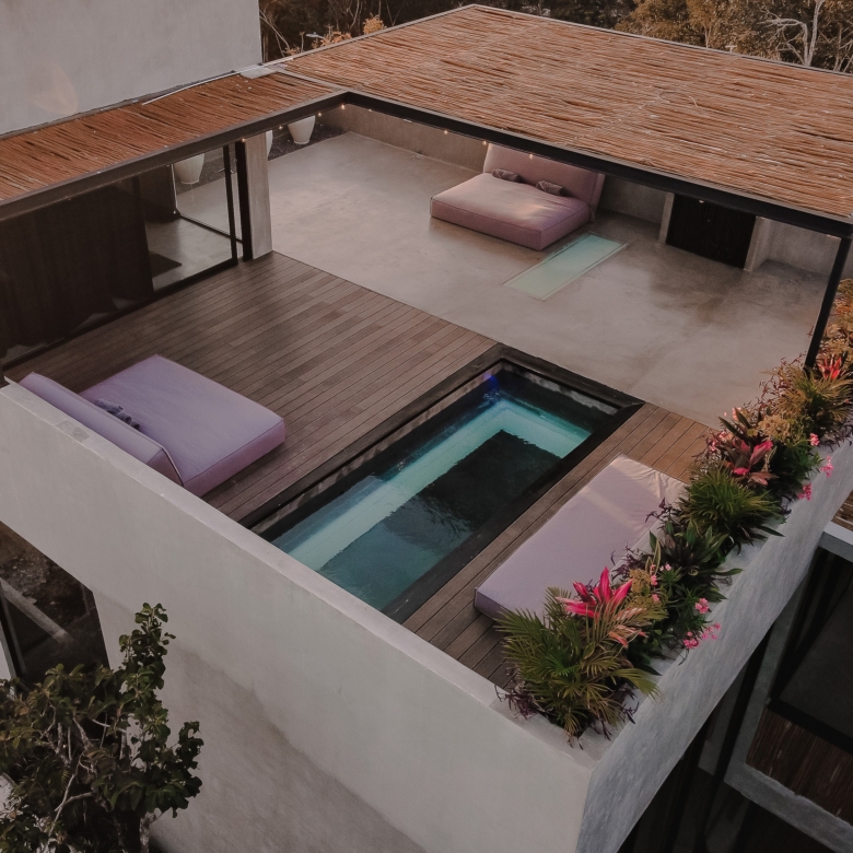 One of the most extraordinary features of Villa Niburu is its expansive rooftop terrace, which provides breathtaking views of the lush Mayan jungle. This private sanctuary includes a second swimming pool, comfortable lounge seating, and a shaded pergola, making it the perfect place to unwind while enjoying the beauty of Tulum. Whether soaking in the rooftop pool or relaxing under the stars, this space offers an unparalleled ambiance of luxury and exclusivity.