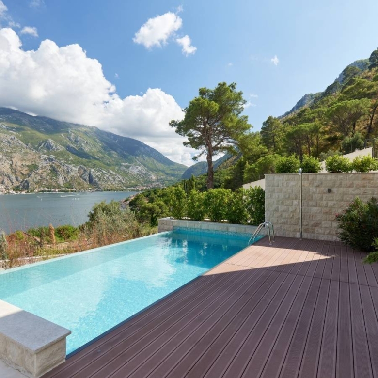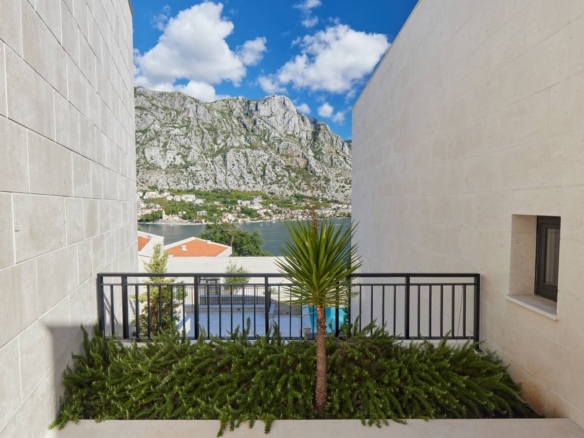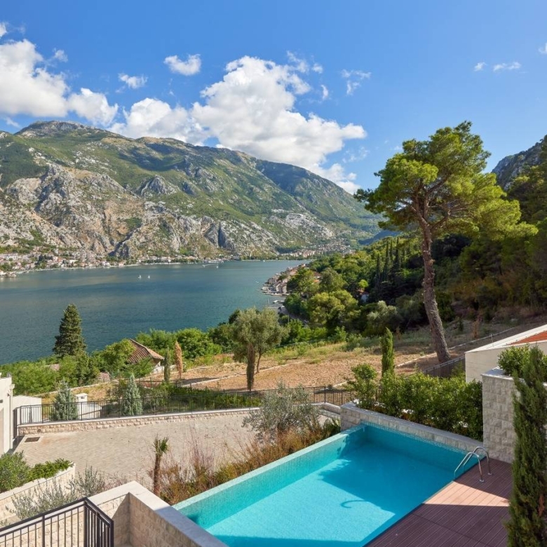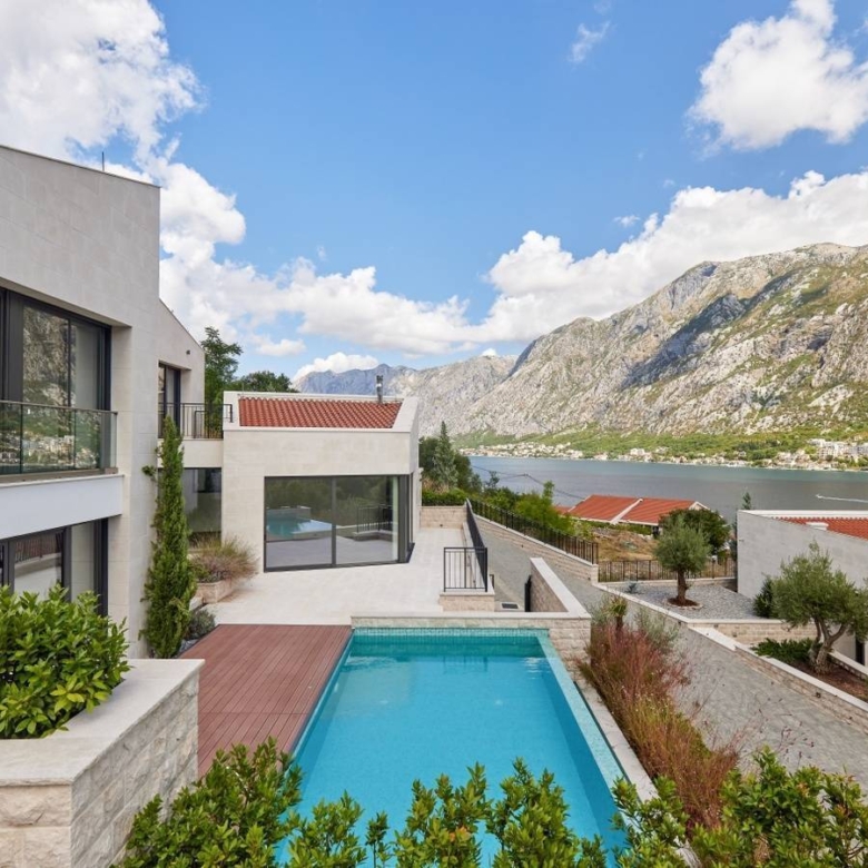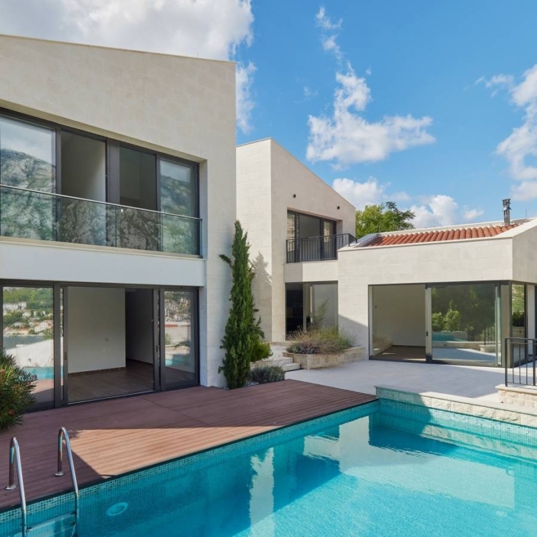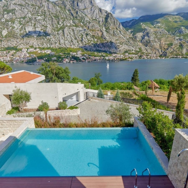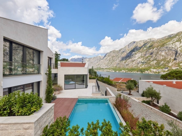 This exceptional Mediterranean villa is situated in a Prčanj, with a beautiful view of Boka Bay and mountains. Approached via a private, securely-gated road, Villa Vela is a spacious 4 bedroom contemporary home with a luxuriously specified interior, infinity pool, and double garage.The villa design is sleek, with clean lines and open, spacious interiors. Mediterranean limestone walls and characteristic sloping terracotta roof tiles float above floor-to-ceiling glass windows to maximize natural light and unobstructed, dramatic views across the Bay towards Kotor Old Town and the mountains beyond.On the ground floor, there is a large double garage, gym, toilet, laundry/utility, storage, and technical rooms (Central Control and AirCon, CCTV, Video Intercom, Fire & Security, WIFI).There is a glass-enclosed entrance reception at the center of the first floor. To the right, there are a high-ceiling living space, wood-burning stove, and kitchen areas with panoramic views of the bay and mountains, and quest toilet. To the left, large master bedroom and bath ensuite opening to decking and pool.On the second floor, there are large double and two standard bedrooms, all with ensuite, outside terrace, and access to walled patio areas and mountainous wild gardens.Premium kitchen (Nobilia/Bosch) and bathroom fittings (V&B, Catalano, HansG), ceramics, and flooring (Florim, Porcelanosa, and natural stone) are used throughout. Living areas and bathrooms with underfloor heating recessed AirCon and ventilation in ceilings.In front of the villa, there is the infinity pool and shower, decking, limestone paving terraces, and BBQ, with substantial wild garden areas.Villa Vela offers the dream combination of peaceful seclusion, whilst lying within easy reach of the local waterfront village marina and a short drive to the historic walled city of Kotor, the luxury yachting haven of Porto Montenegro and Tivat International Airport.