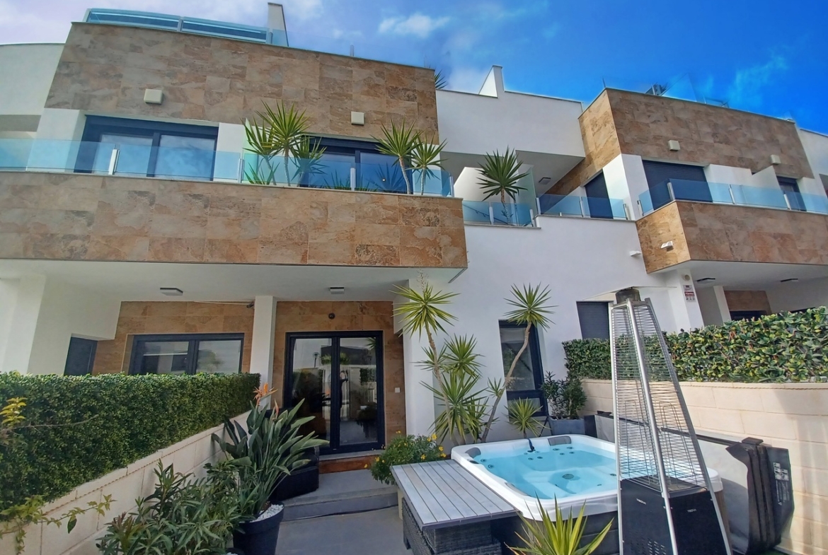 Built in 2019 this ultra slick triplex townhouse for sale is located in a sought after location, just minutes from Villamartin plaza and golf course. The property sits on a private dual aspect plot with sunshine all day and private access to the communal swimming plot from the rear patio and utility area. Inside the house is a very large living and dining room with spectacular fully equipped kitchen, guest bathroom and access to the rear patio. Upstairs you with find 2 wonderul bedrooms, one with a private terrace overlooking the swimming pool and both with ensuite bathrooms. An external staircase leads upstairs to the private solarium which has been finished with artificial grass and again boasts views over the swimming pool. The property is sold with lots of extras including designated parking, underfloor heating in the bathrooms, automatic blinds and hydromassage column in bathroom.