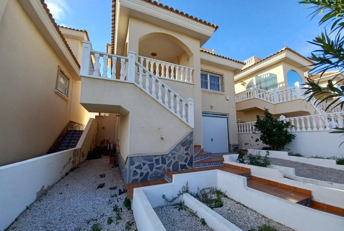 Detached villa for sale with views towards the sea in a very convenient location just an easy 5 minute walk to a vast assortment of bars, convenience stores and restaurants. This attractive villa sits in the middle of a 234m2 plot with a private driveway and access to the garage from the front and a great space to the rear with plenty of room to build a private swimming pool like other residents in the neighbourhood. The property is built over two levels with the ground floor comprising of a huge living and dining room and the open plan kitchen. There are two great sized bedrooms and a family bathroom. Upstairs is the very impressive master bedroom with en-suite bathroom which also boasts private access to two sunny terraces, one of which has views towards the Mediterranean sea. The property would make a great family home for both permanant use or fabulous holidays.
